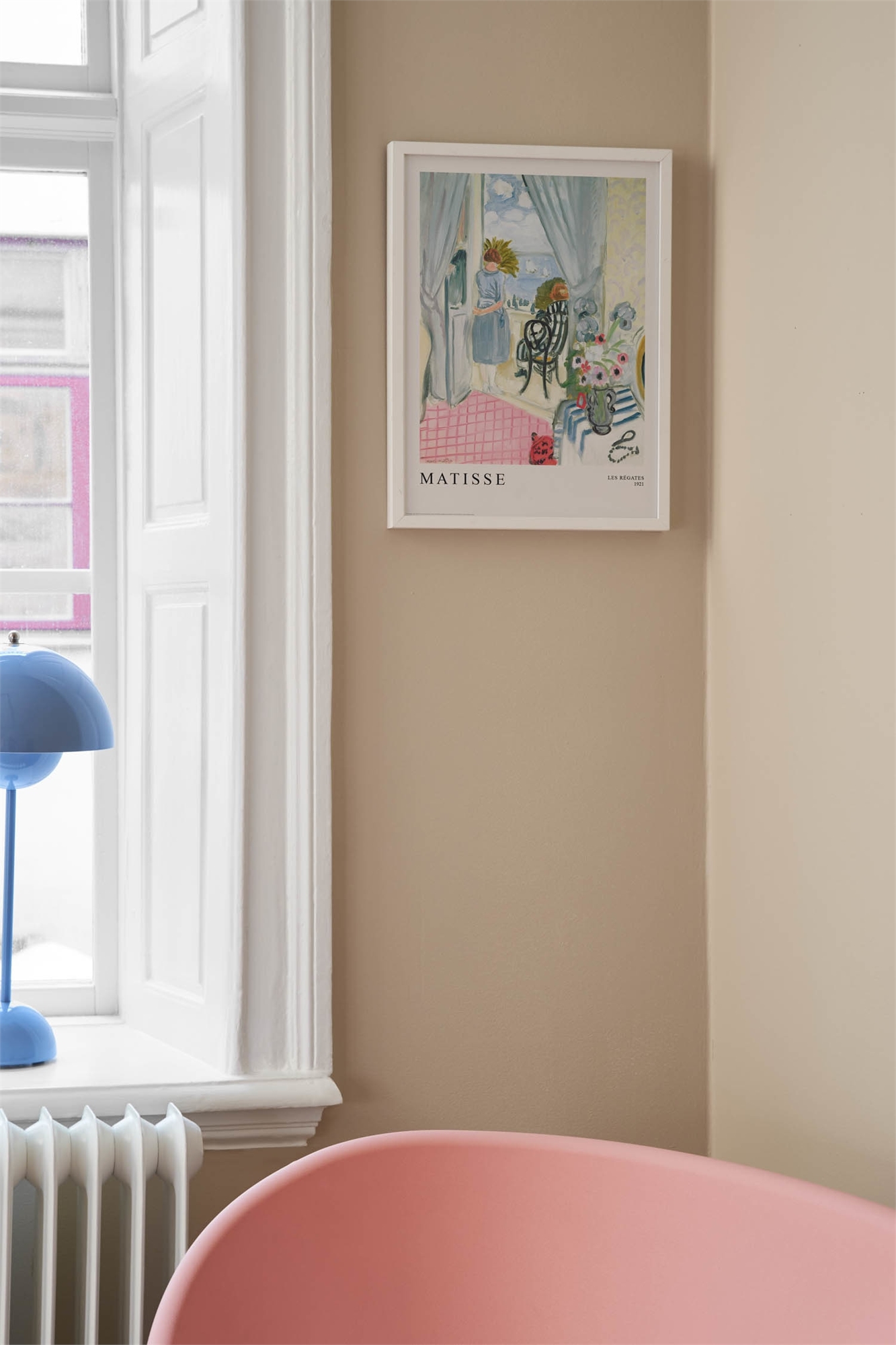 Нарисованный мотив женщины, стоящей на дверной раме балкона и смотрящей на океан. Внутри комнаты изображен розовый пол и цветы в вазе на столе. Оригинальный мотив был создан маслом на холсте Анри Матиссом в 1921 году. Мотив обрамлен встроенным белоснежным паспарту.