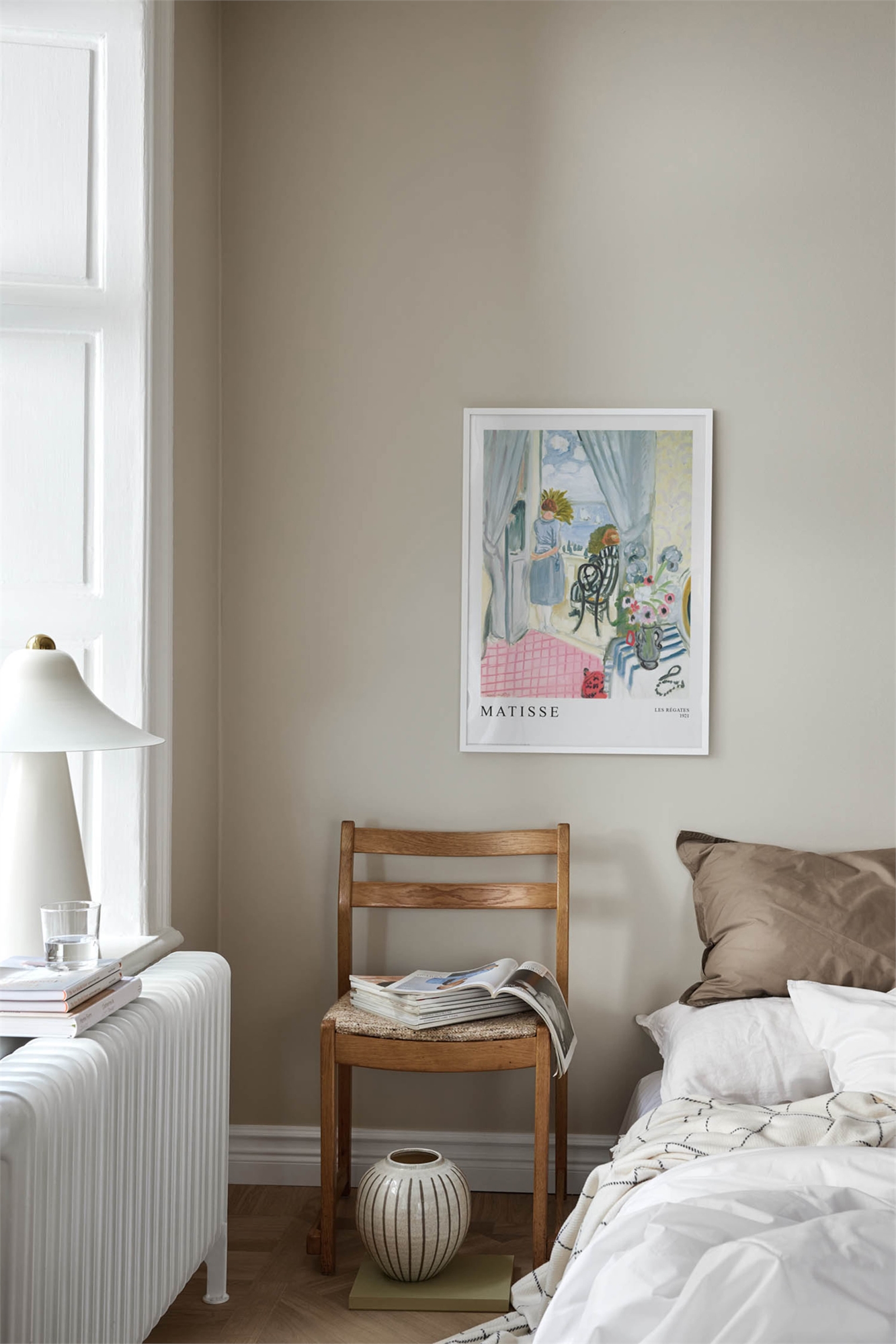 Нарисованный мотив женщины, стоящей на дверной раме балкона и смотрящей на океан. Внутри комнаты изображен розовый пол и цветы в вазе на столе. Оригинальный мотив был создан маслом на холсте Анри Матиссом в 1921 году. Мотив обрамлен встроенным белоснежным паспарту.