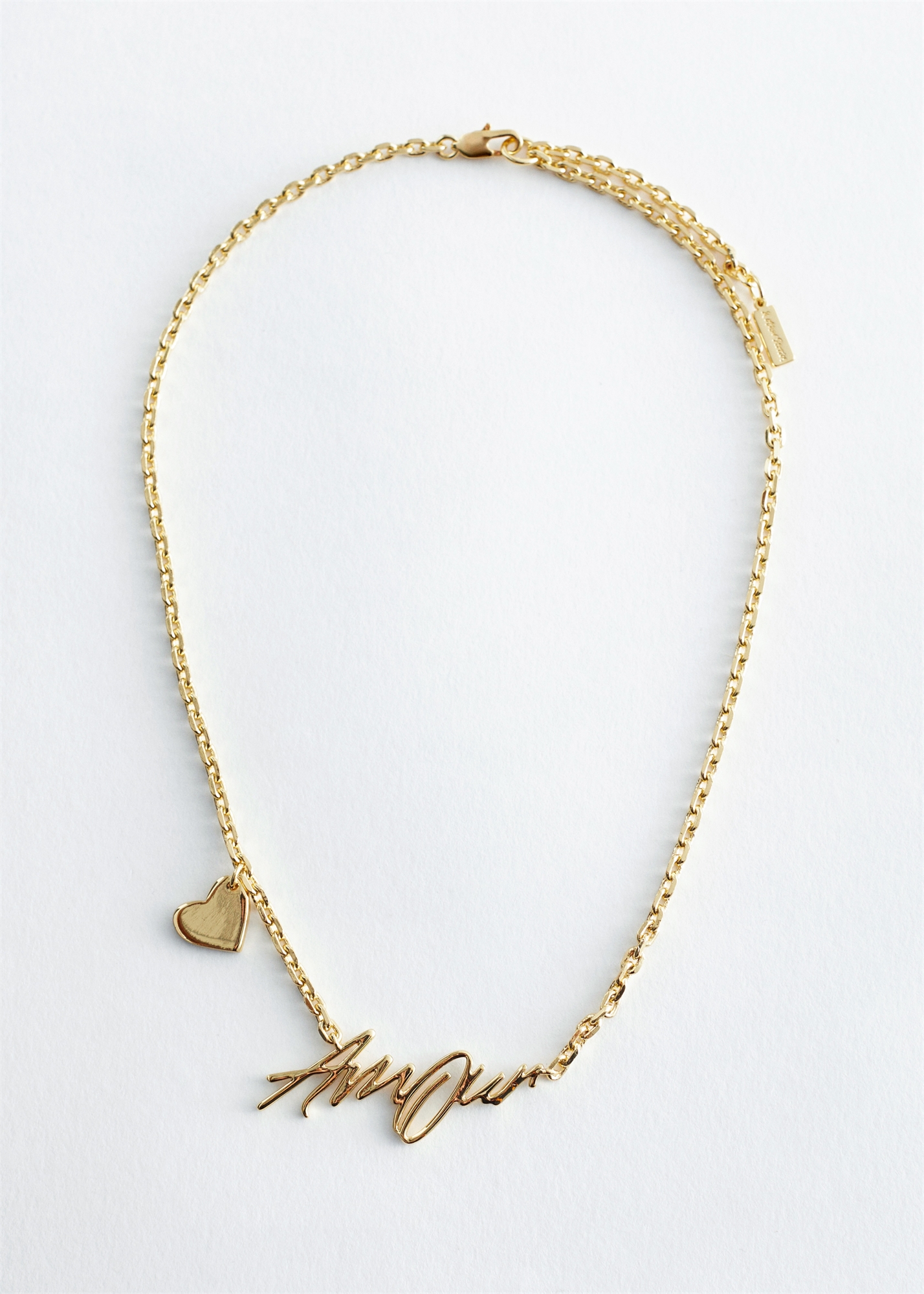 Это короткое ожерелье из полированной латуни на тонкой цепочке роло с подвеской в виде текста с надписью Amour на передней панели. С одной стороны цепочки расположен шарм в виде сердца. Регулируемая длина и застежка-триггер. Общая длина: 43 см / 17” Ширина текстового мотива: 4,5 см / 1,8” Высота шарма-сердца: 1,2 см / 0,5”