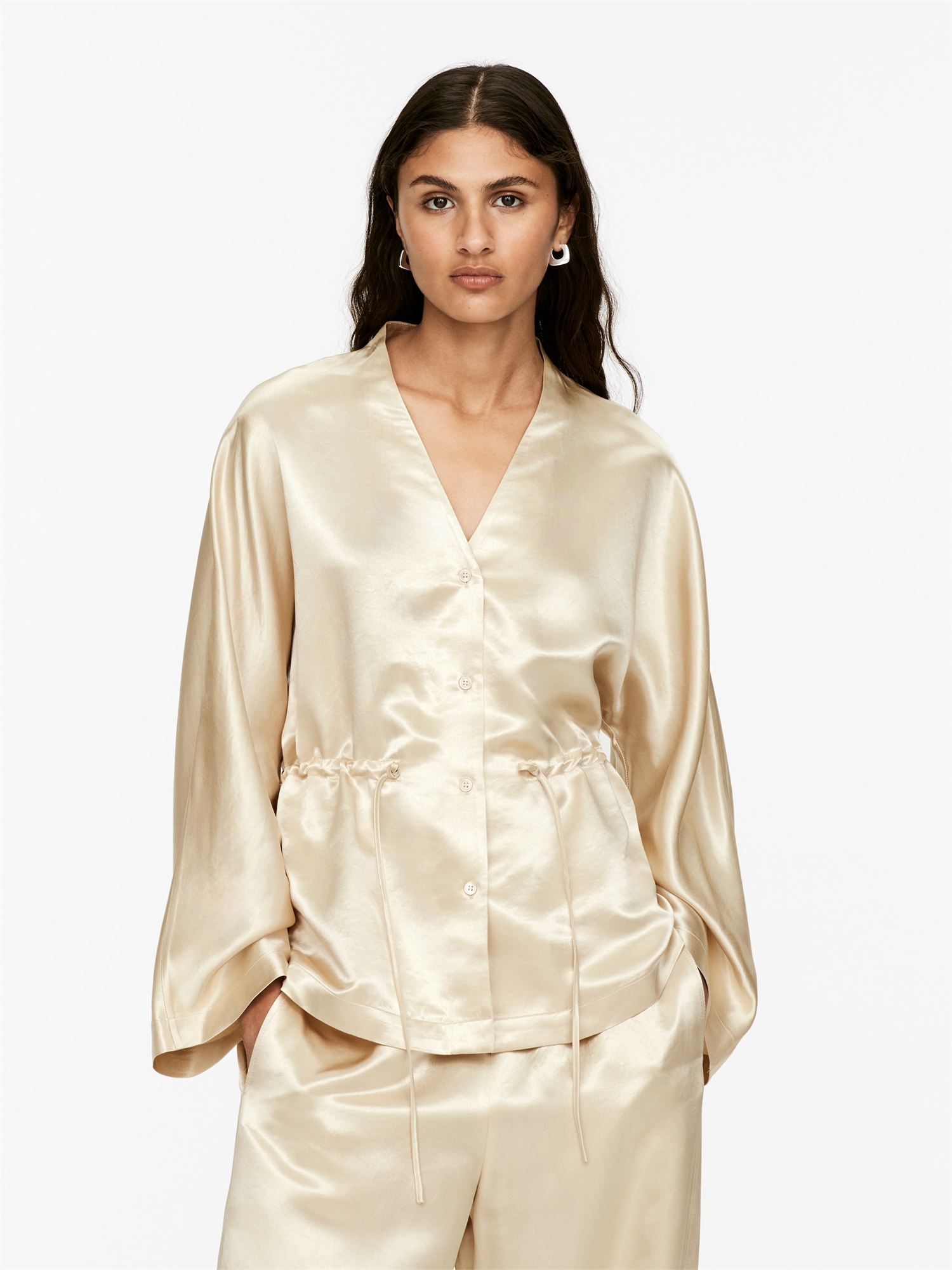 Блузка с рукавами-кимоно и регулируемыми ремешками на талии для создания эффекта пеплума. V-образный вырез и застежка на пуговицы. Обычный крой.