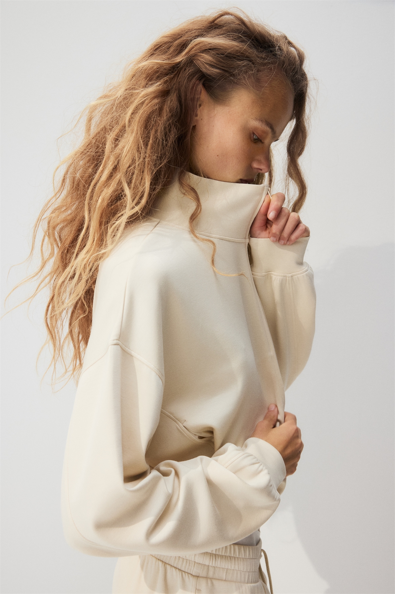 Куртка из супермягкого трикотажа с воротником-стойкой и потайной застежкой-молнией спереди. Спущенные плечи, длинные рукава с манжетами и направленные вперед боковые швы с незаметными карманами.