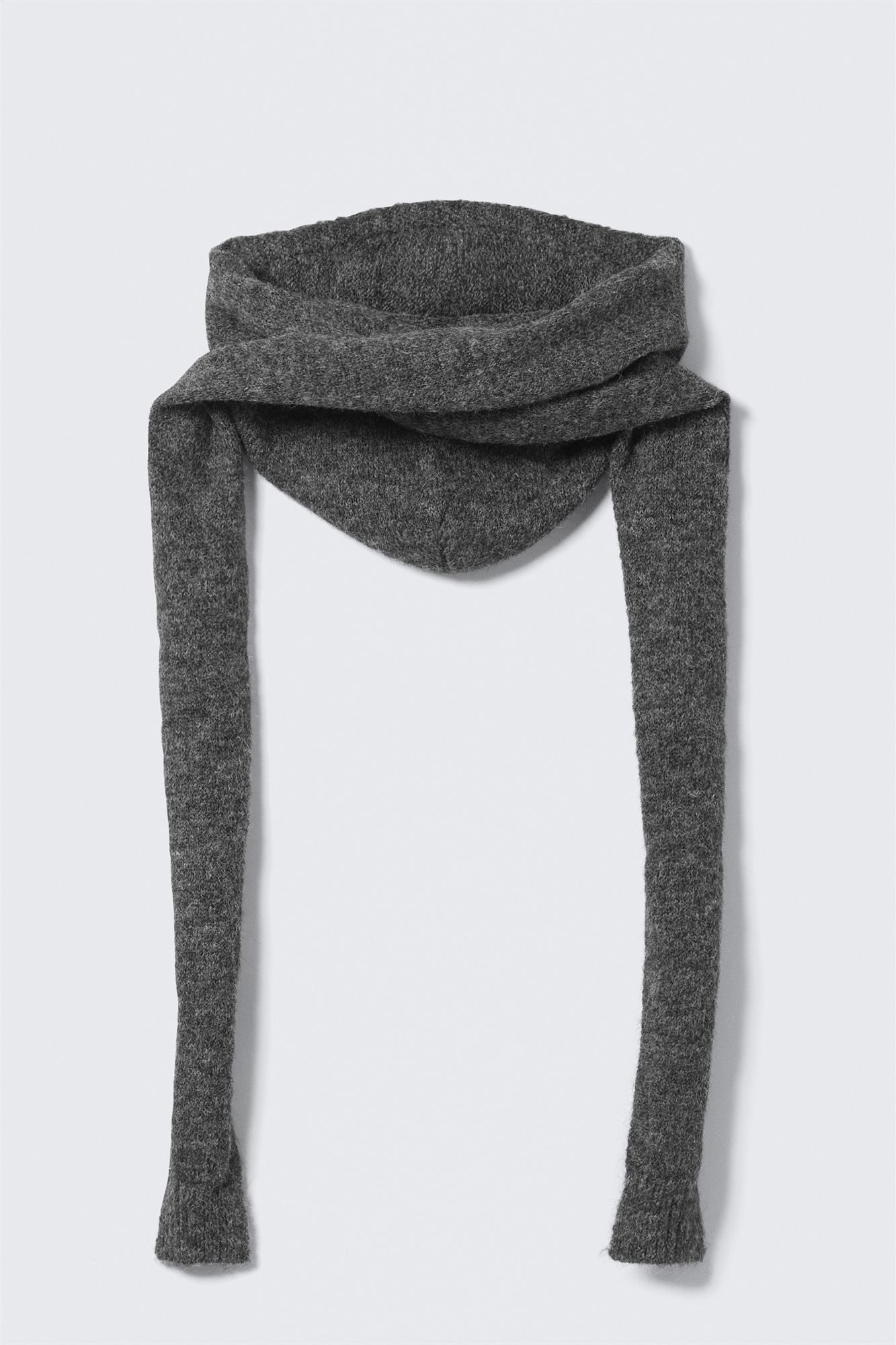 Вязаный шарф со встроенным капюшоном и длинными тонкими завязками. Созданный из мягкого однотонного трикотажа с ребристыми краями, он ’предназначен для обертывания, завязывания или драпировки, как вам нравится. Легкая многослойность, сочетающая шарф и головной убор в одном минимальном образе.