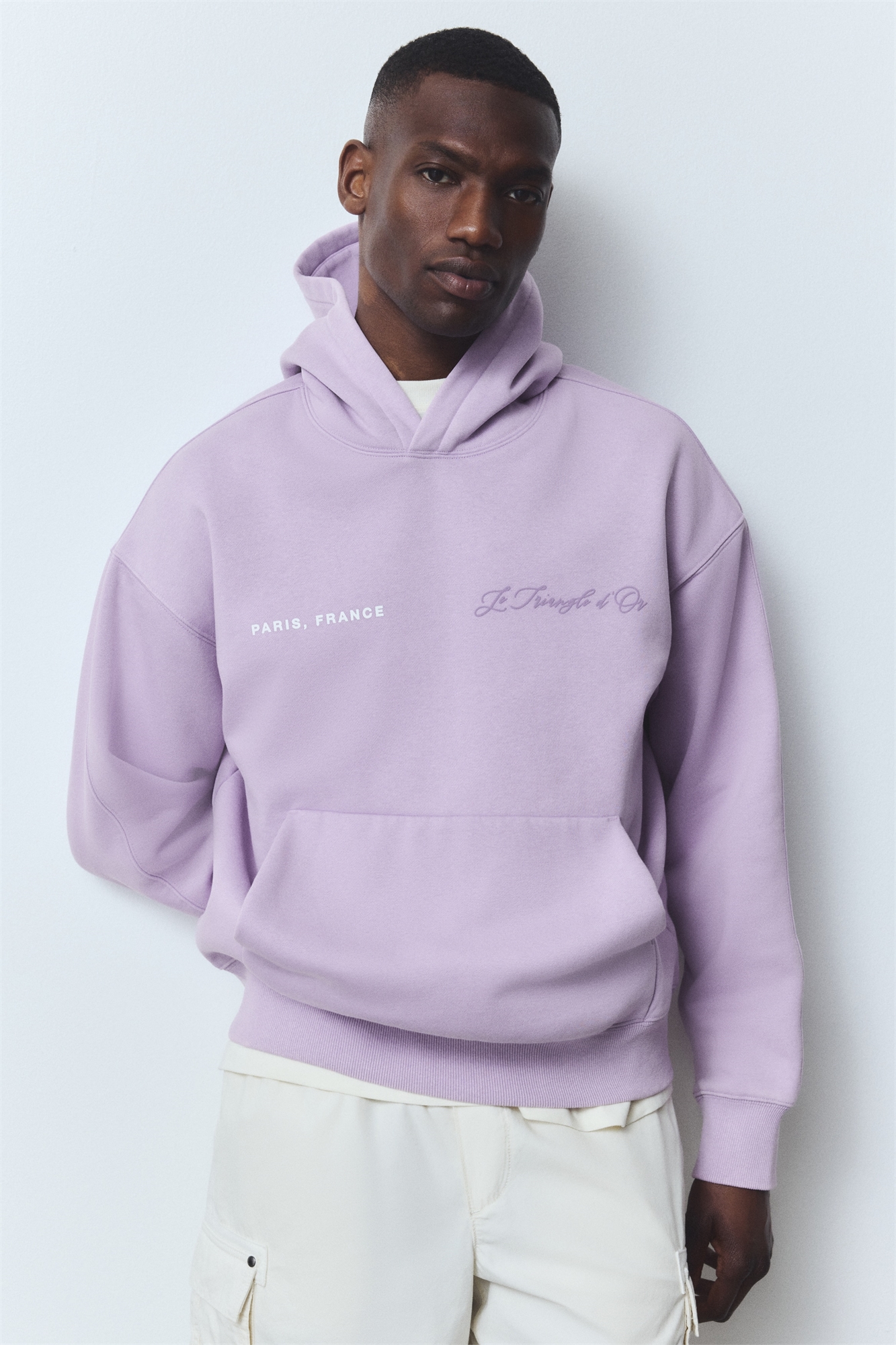 Толстовка с принтом из плотной хлопковой ткани с мягким начесом внутри. Спущенные плечи, длинные рукава, карман-кенгуру, широкие манжеты и подол в рубчик. Свободный крой для объемного, но не чрезмерно большого силуэта.