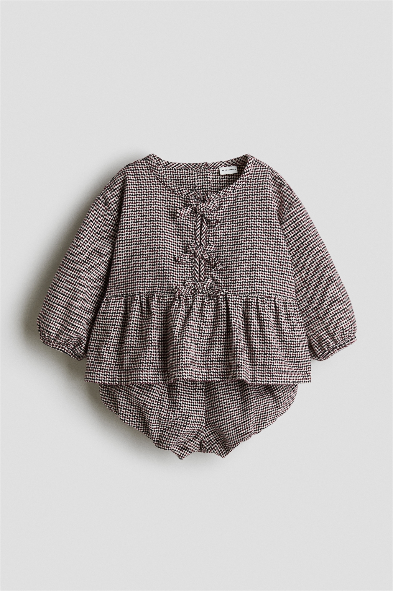 H&M Adorables. Комплект из блузки и трусиков-распашонок из мягкой саржи, изготовленной из высококачественного хлопка. Блузка с вертикальным швом в верхней части, украшенным маленькими декоративными бантиками. Круглый вырез, застежка на пуговицы сзади и длинные рукава с узкими эластичными манжетами. Сборки на талии и пеплум. Блумеры с эластичной талией и пузырями на кайме. Блумеры на подкладке из мягкого хлопкового полотна. Коллекция H&M Adorables - это подборка удобных и качественных вещей, не теряющих актуальности.