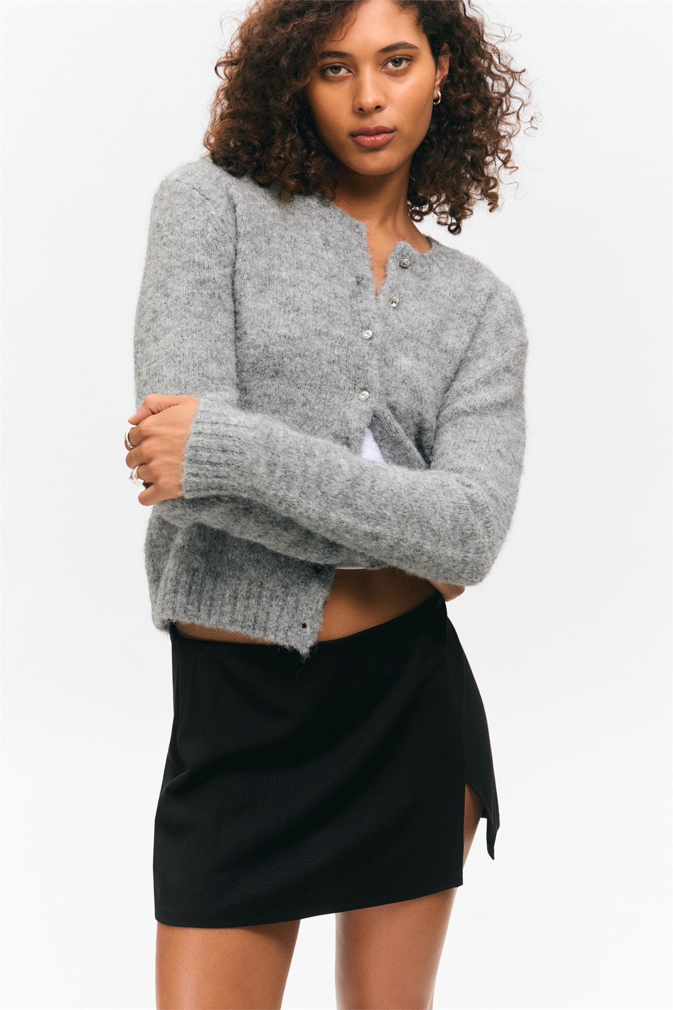 Юбка-мини со средней посадкой, выполненная из мягкой ткани Punto di Roma. Она имеет четкий силуэт, разрез спереди и эластичный пояс. Подол обработан двойной строчкой для придания образу структурированности.
