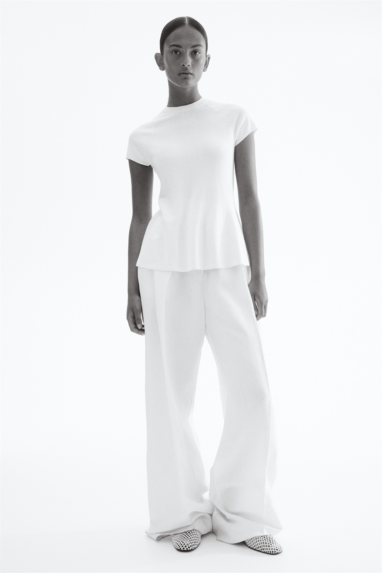 Приталенный топ из мягкого тонкого трикотажа с ребристой горловиной, короткими рукавами реглан и расклешением от талии до подола.