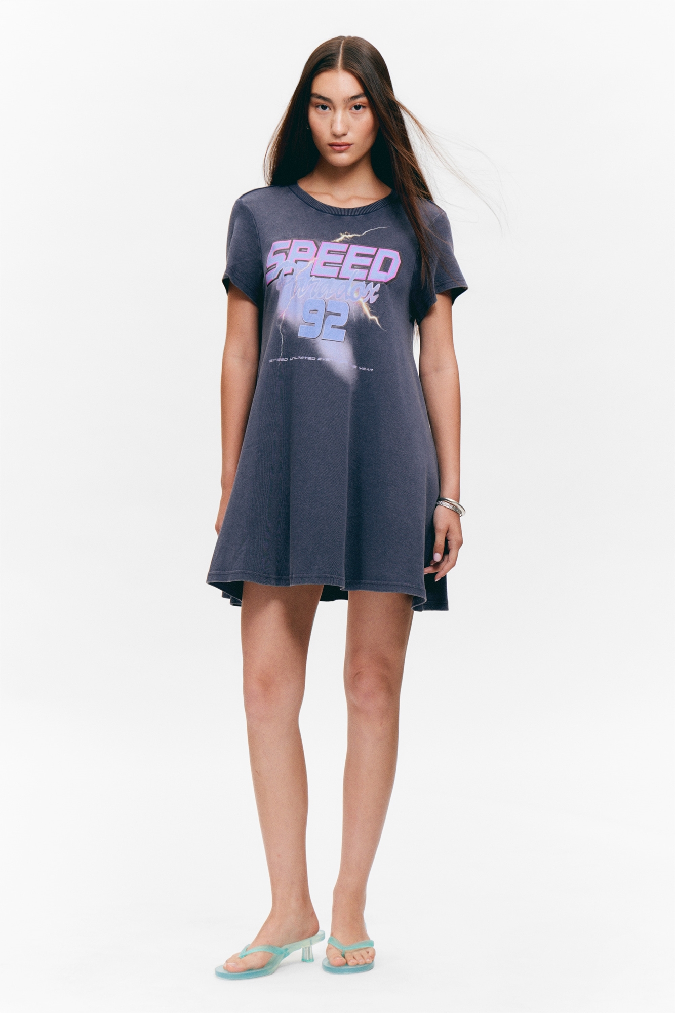 Мини-платье с короткими рукавами и расклешенным А-линией силуэтом. Изготовленное из мягкого хлопкового джерси, оно имеет круглый вырез, тонкие детали швов и чистый подол. Создано для мягкой, но структурированной драпировки и легкой, непринужденной посадки по фигуре.