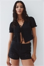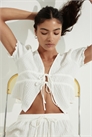 Короткий, приталенный топ из махрового трикотажа с принтом на всю длину. Глубокий V-образный вырез и два комплекта завязок под бюстом, которые завязываются спереди и создают мягкий расклешенный подол. Короткие рукава с эластичной отделкой и оверлоком на манжетах.