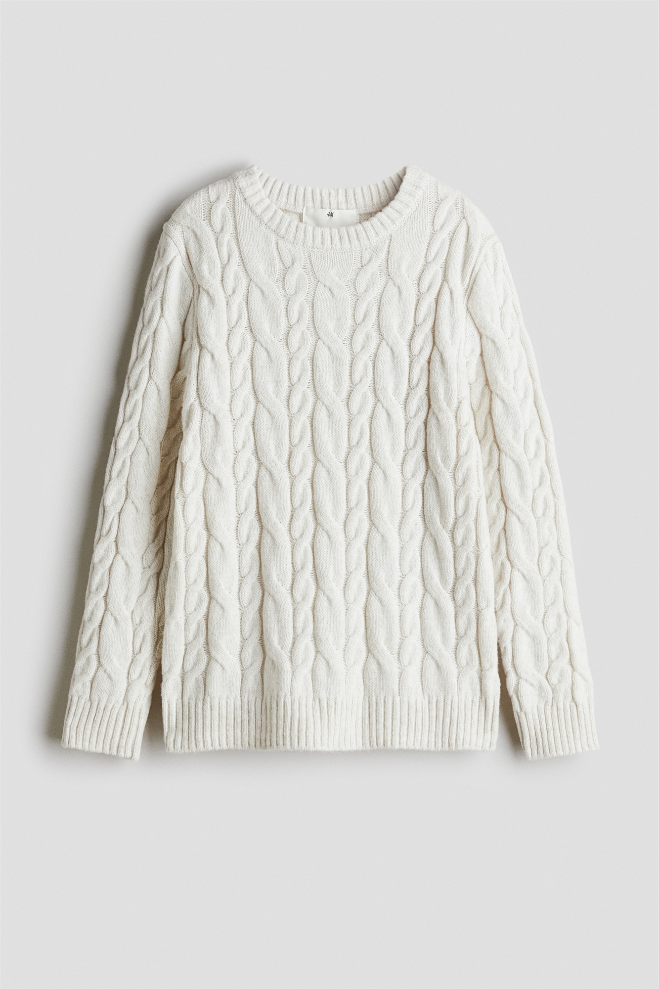 Джемпер из мягкого трикотажа в косы с добавлением шерсти. Круглый вырез с ребристой отделкой, длинные рукава, манжеты и подол в рубчик.