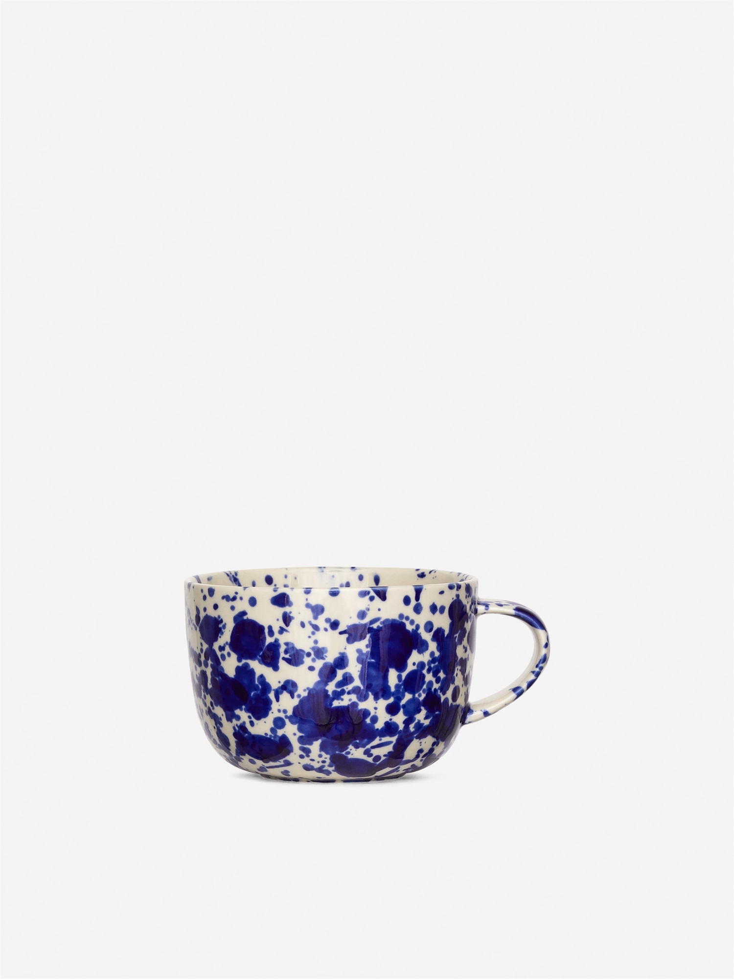 Чайная чашка с ручкой. Чашка изготовлена из керамогранита, имеет слегка неправильную форму и расписан вручную узором из брызг. Каждое изделие имеет уникальную отделку. Диаметр 11 см, высота 7,5 см.