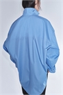 Рубашка свободного покроя из хрустящего хлопкового поплина с заостренным воротником и пуговицами спереди. Двухслойная стойка, спущенные плечи и длинные широкие рукава с манжетами на пуговицах и рукавной планкой с пуговицей. Изогнутый подол с высокими боковыми вентиляционными отверстиями. Слегка удлиненный сзади.