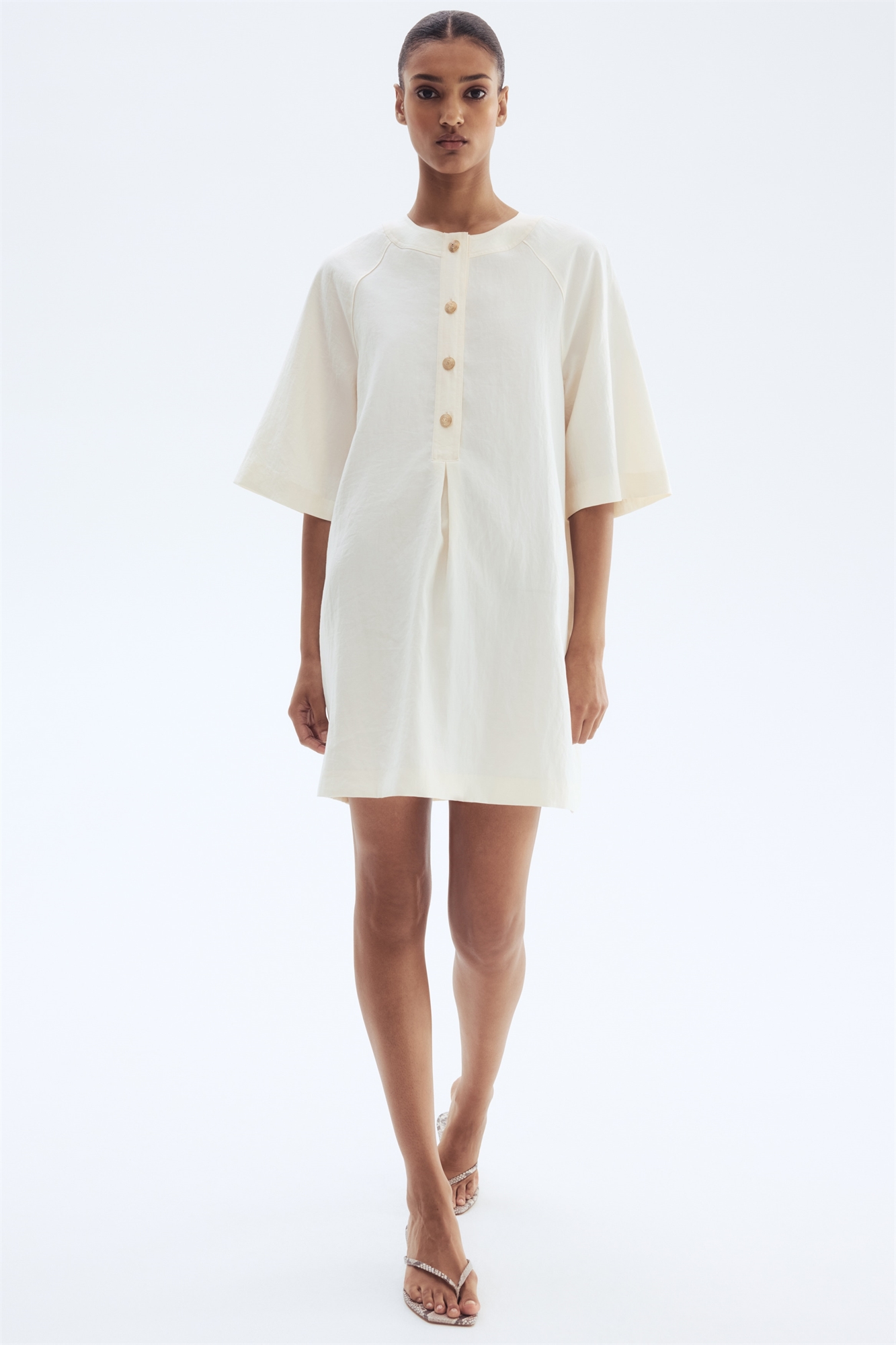 Короткое платье из вискозного бленда. Круглый вырез и застежка на пуговицах спереди с перевернутой складкой внизу. Широкие рукава длиной до локтя покроя реглан. Без подкладки.