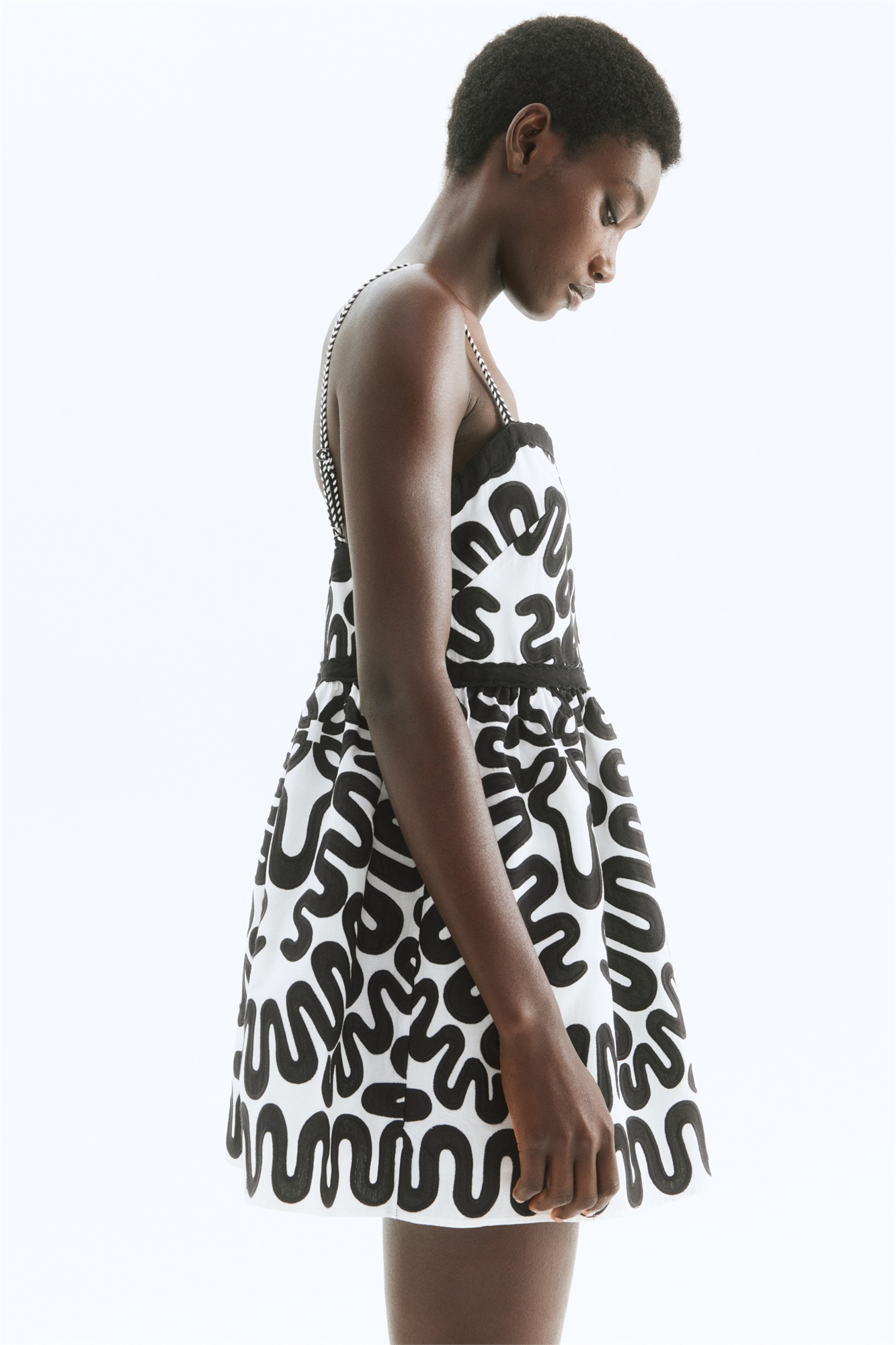 Короткое платье из хлопкового полотна с вышитым узором и гребешковой отделкой по верху и на талии. Узкие регулируемые бретели и приталенный лиф с прямым вырезом и потайной застежкой-молнией с одной стороны. Сборки на талии и расклешенная юбка. На подкладке.