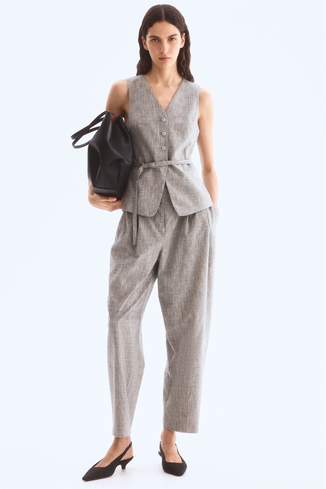 Приталенные брюки длиной до щиколоток из тканого материала из смеси льна. Ширинка на молнии со скрытой пуговицей и застежкой на крючок, диагональные боковые карманы и накладной задний карман на пуговице. Шаровары со складками спереди.