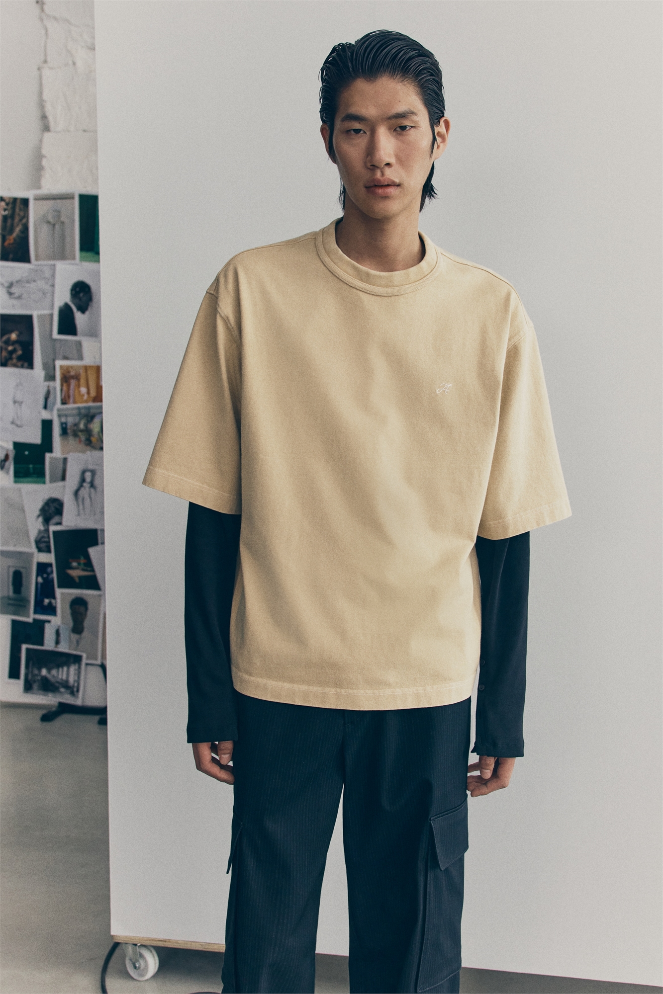 Футболка в боксерском стиле из мягкого плотного хлопкового джерси с маленькой вышитой буквой на груди. Модель имеет свободный крой, круглый вырез с ребристой отделкой, спущенные плечи, вырез на спине и прямой подол.