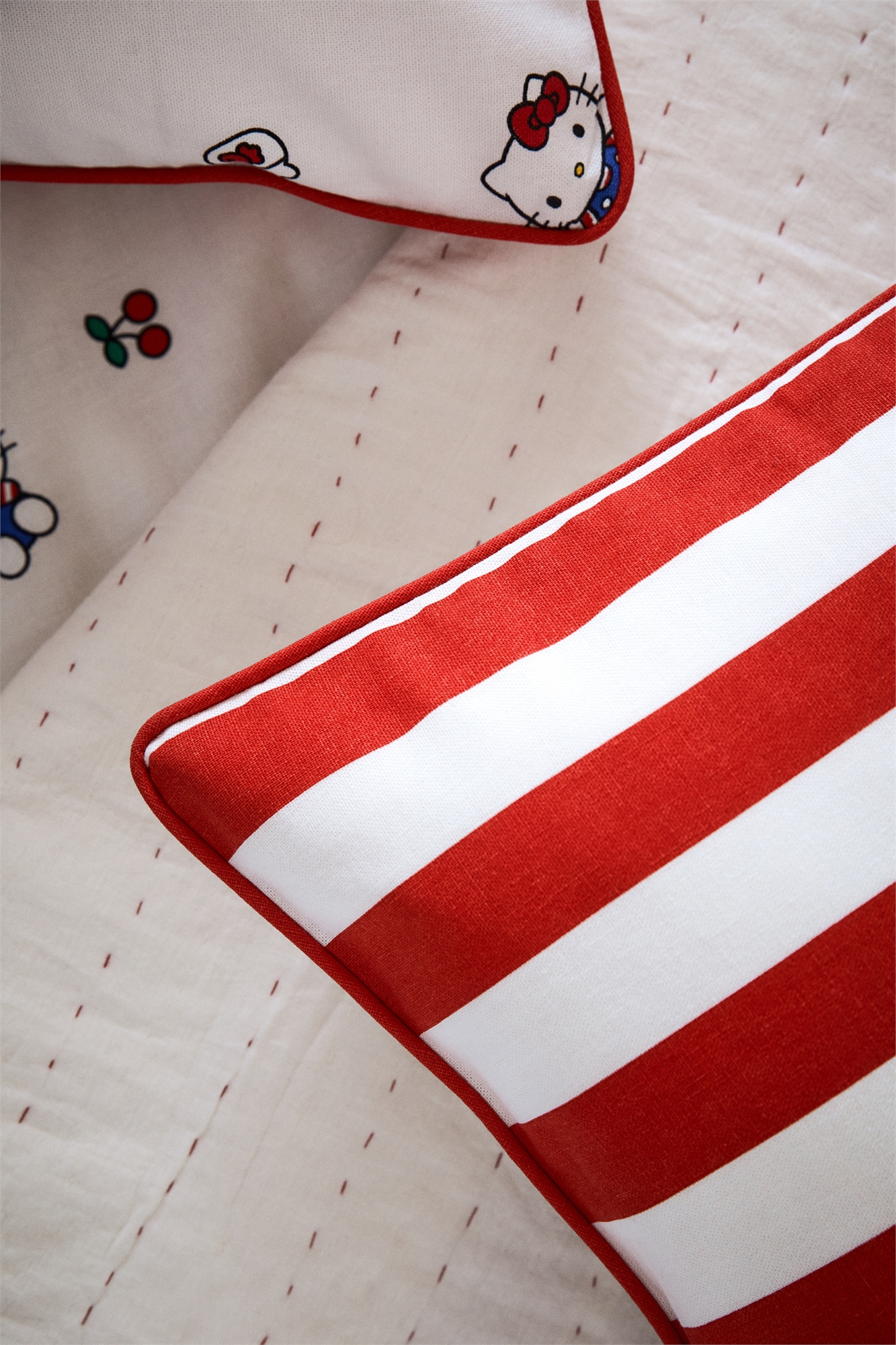 Чехол для подушки из хлопкового холста с очаровательным рисунком Hello Kitty и ее любимых вещей на лицевой стороне и полосатым рисунком на обратной стороне. Отделан декоративной тесьмой по краям и застегивается на молнию с одной стороны.