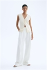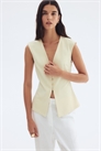 Приталенный жилет из плотного трикотажа интерлок с рукавами-кап, глубоким V-образным вырезом и маленькими металлическими пуговицами до талии, создающими мягкий расклешенный крой от талии вниз.