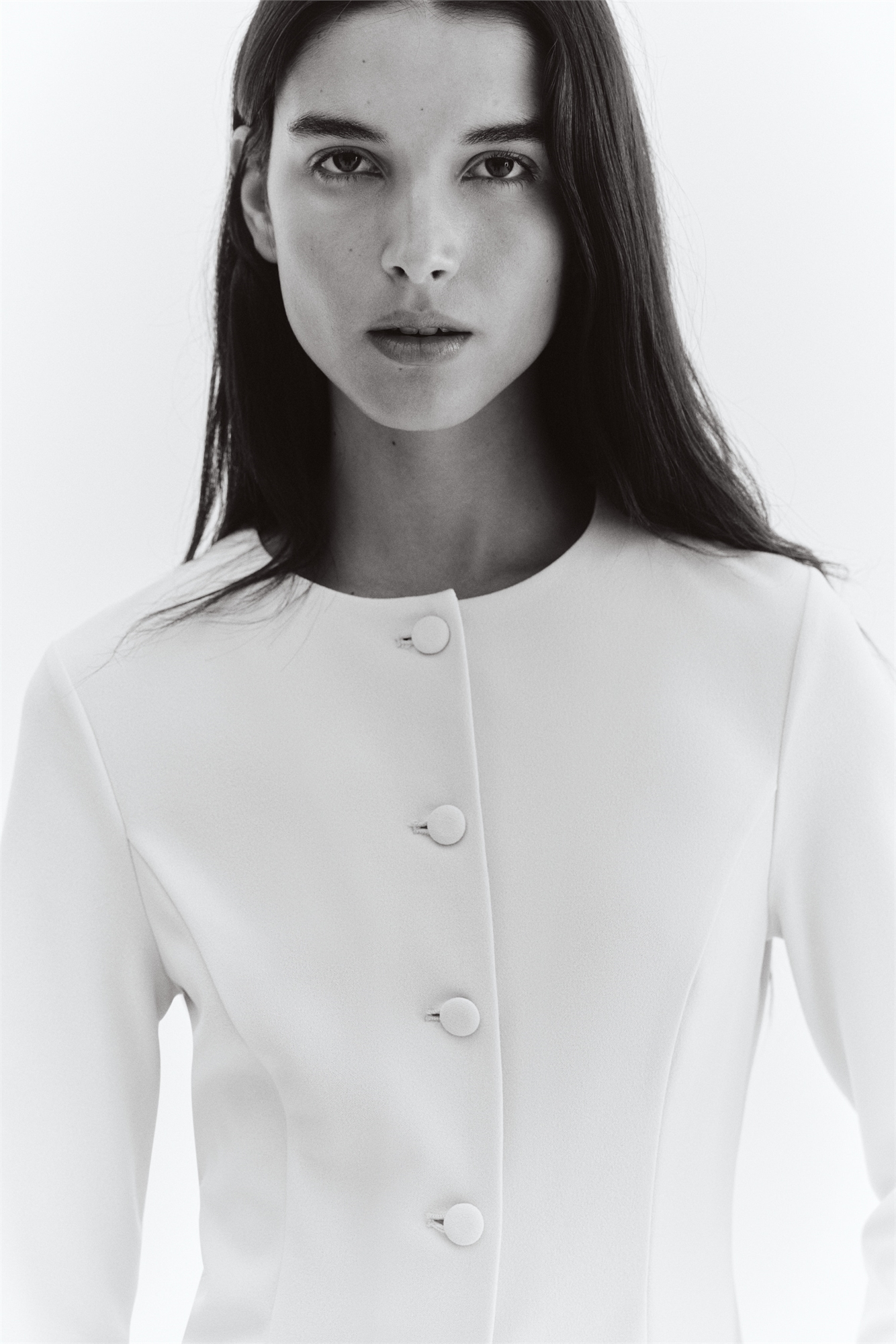 Приталенный блейзер из плотного трикотажа интерлок с круглым вырезом и закрытыми пуговицами до талии, создающими мягкий расклешенный крой от талии вниз. Швы "принцесса" спереди и сзади придают силуэту привлекательность.