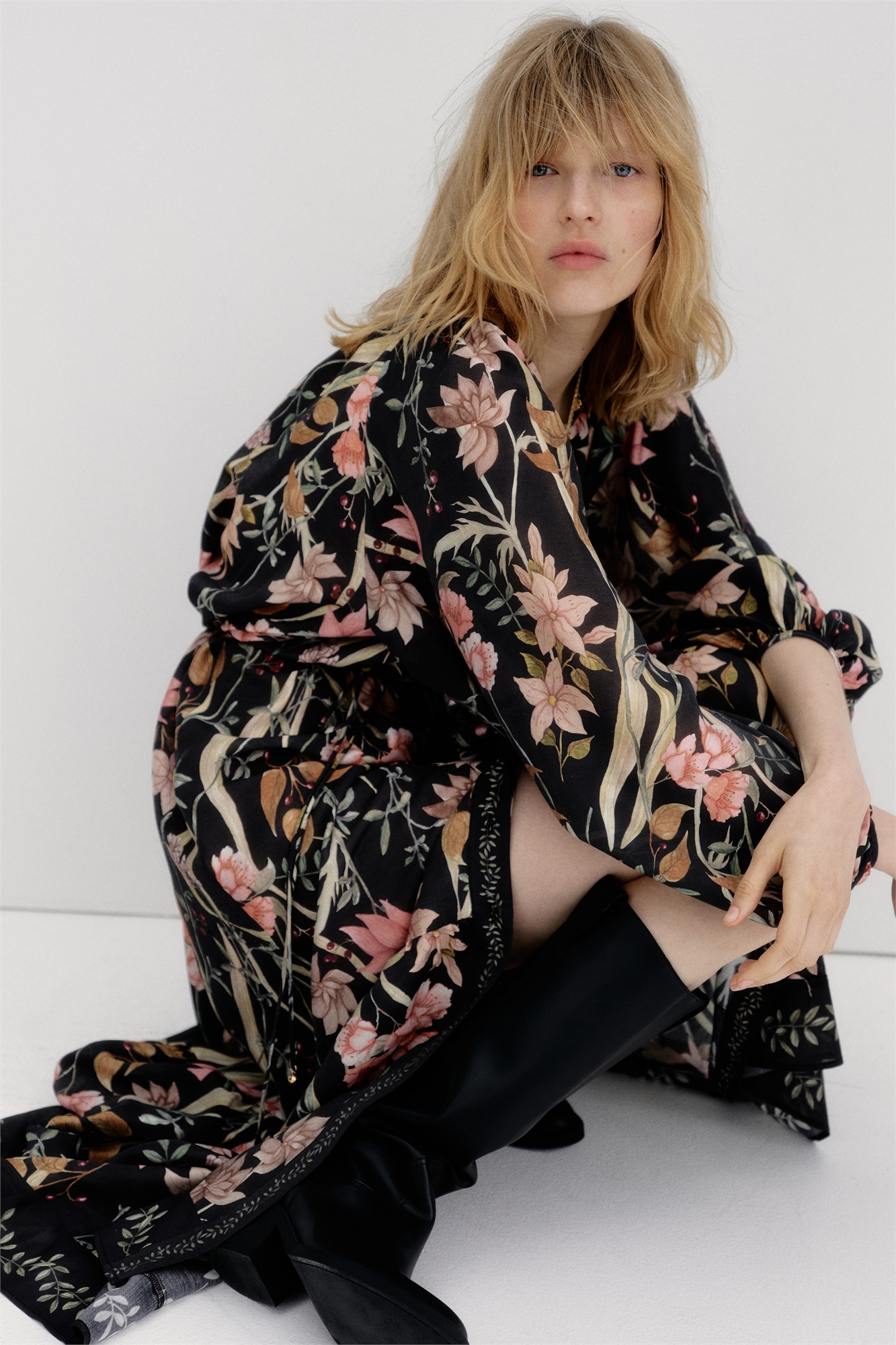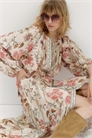 Платье длиной до щиколоток из вискозного бленда с легким блеском. Круглый вырез со складками по всему периметру, застежка на пуговицы спереди и узкий съемный пояс-завязка на талии с декоративной бусиной на концах. Длинные рукава реглан с узкими манжетами. Шов над подолом для придания дополнительного объема. Без отделки.