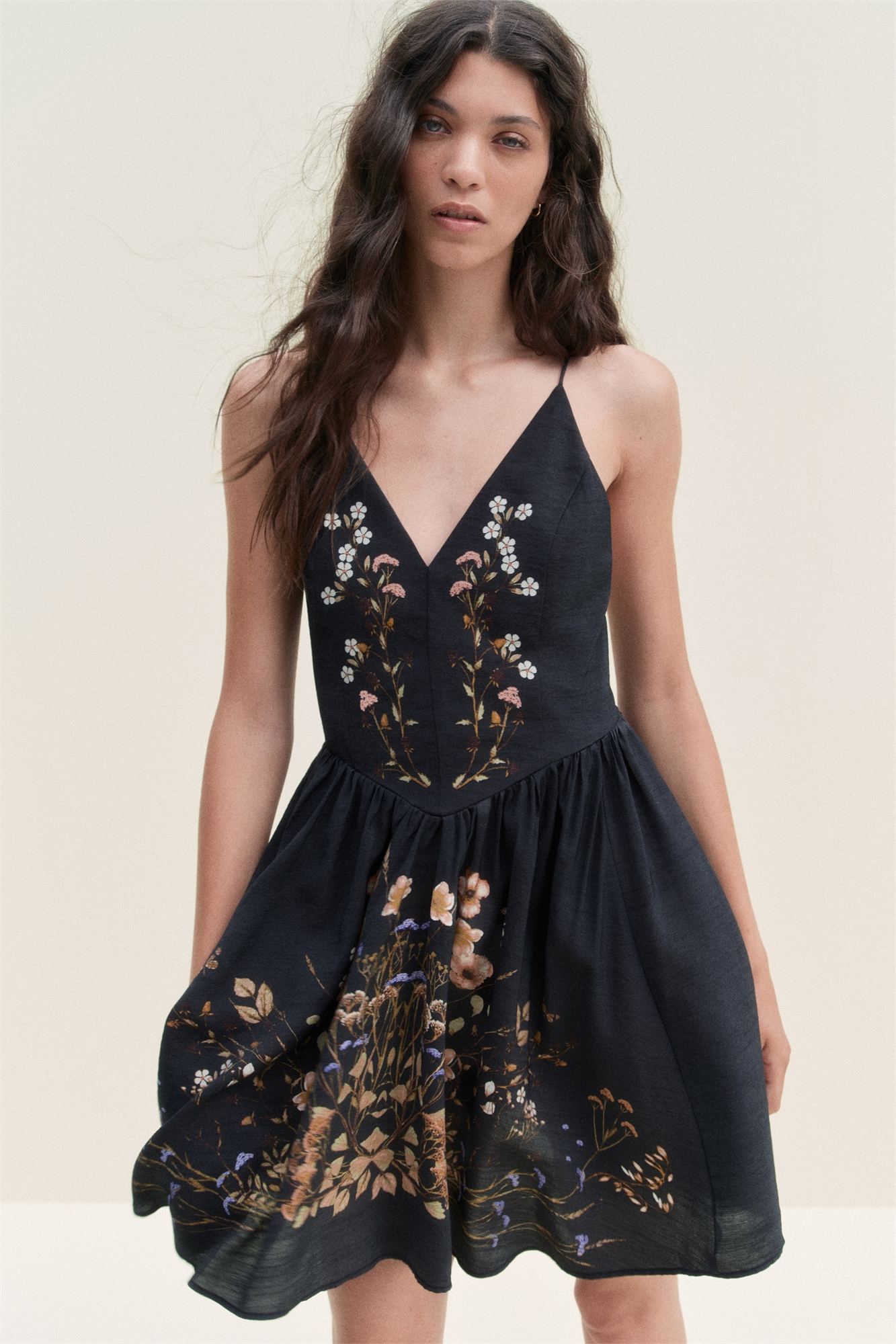 Короткое приталенное платье из тканого материала с глубоким V-образным вырезом и регулируемыми бретелями-спагетти, перекрещивающимися на спине. V-образный сборчатый шов на талии и расклешенная юбка. Потайная застежка-молния сзади. Лиф на подкладке.