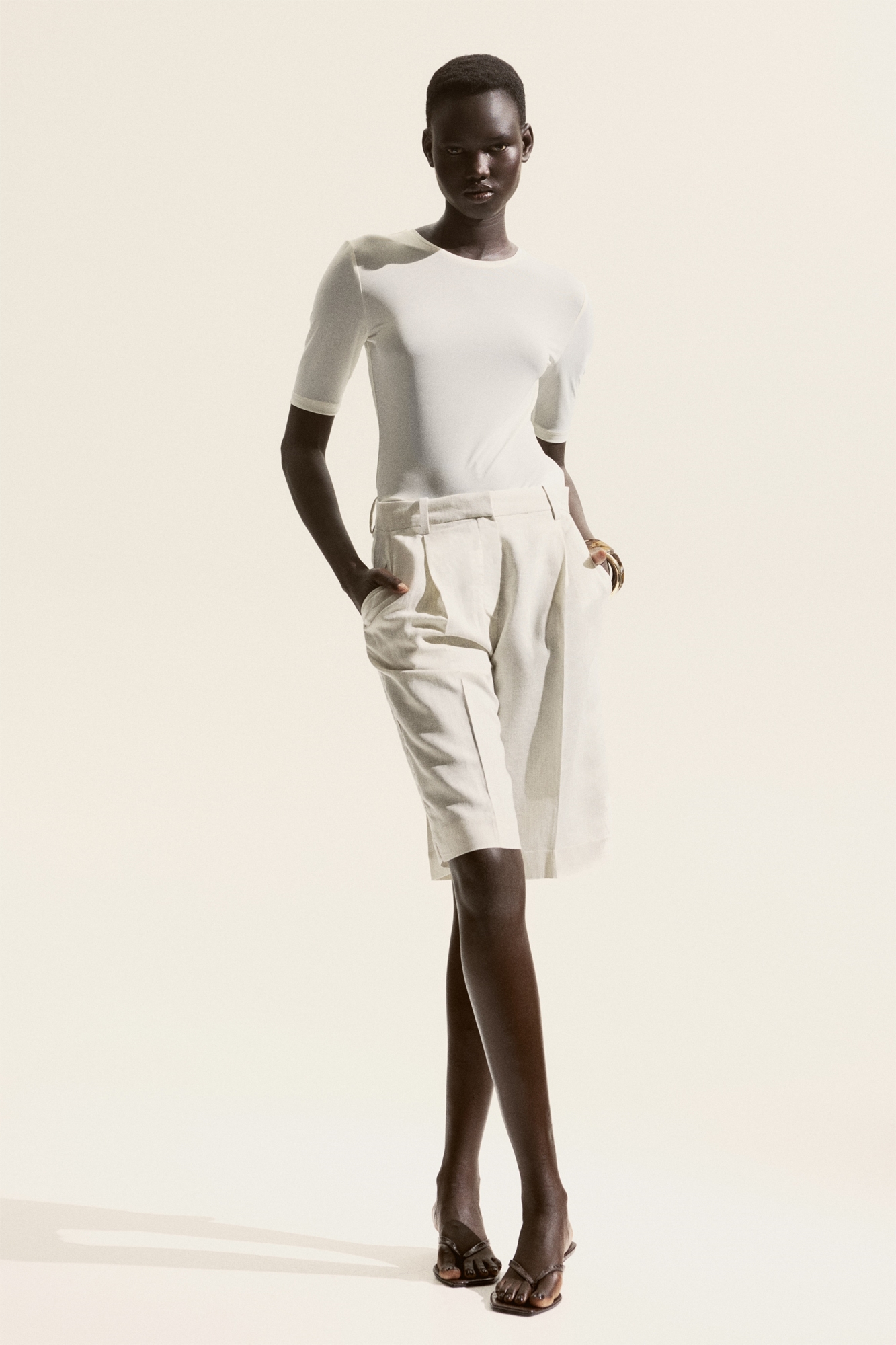 Облегающая футболка из мягкого, эластичного трикотажа с круглым вырезом и рукавами, заканчивающимися чуть выше локтей.