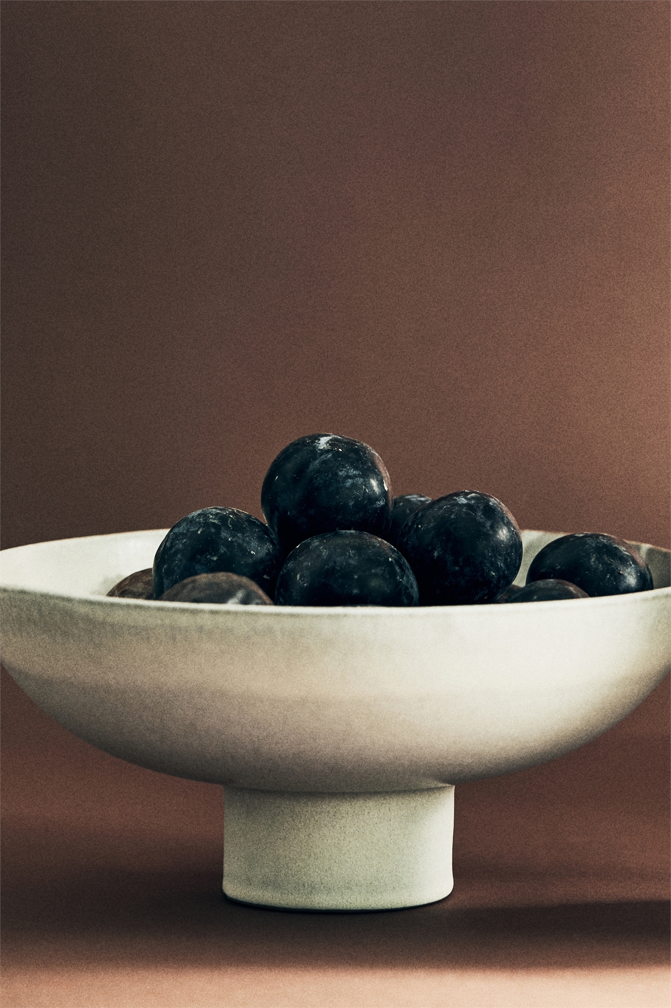 Круглая терракотовая сервировочная чаша на цилиндрической ножке. Ручная глазурь в органической цветовой палитре, что делает каждый предмет уникальным.