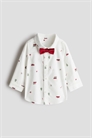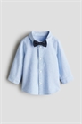 Комплект состоит из рубашки из мягкого хлопкового полотна и предварительно завязанного галстука-бабочки. Рубашка с воротником и пуговицами спереди и на манжетах. Галстук-бабочка из тканого материала с регулируемым эластичным ремешком и пластиковой застежкой сзади.