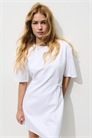 Короткое платье из жесткого хлопкового денима с круглым вырезом, потайной застежкой-молнией сзади, спущенными плечами и короткими рукавами. Формообразующие швы спереди и сзади, а также металлические пряжки по бокам талии для создания приталенного силуэта.