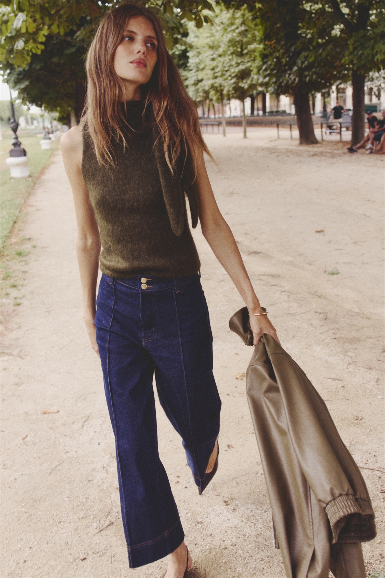 Облегающий топ без рукавов из мягкого трикотажа с содержанием мохера и шерсти. Воротник-шарф с трубчатой отделкой и отверстием для продевания другого конца. Узкая тесьма по подолу.
