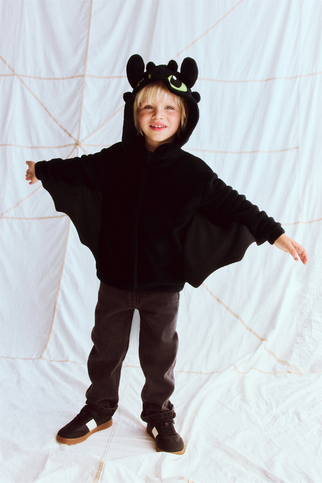 Маскарадный костюм на молнии из мягкого флиса с отстегивающимся хвостом. Капюшон с аппликацией, застежка-молния спереди и длинные рукава-крылышки. Хвост с мягкой подкладкой, застегивающийся на крючок и петлю.