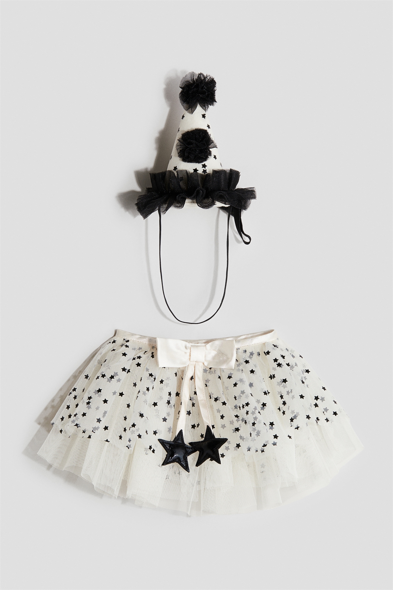 Маскарадный набор с конусообразной шапкой и двухслойным тюлевым воротником-накидкой. Шапка из войлока с набивным тюлем, с игривыми помпонами и оборкой. Воротник-накидка с атласной обвязкой по вырезу горловины и отверстием спереди с застежкой на крючок и петлю, украшенным атласным бантиком.