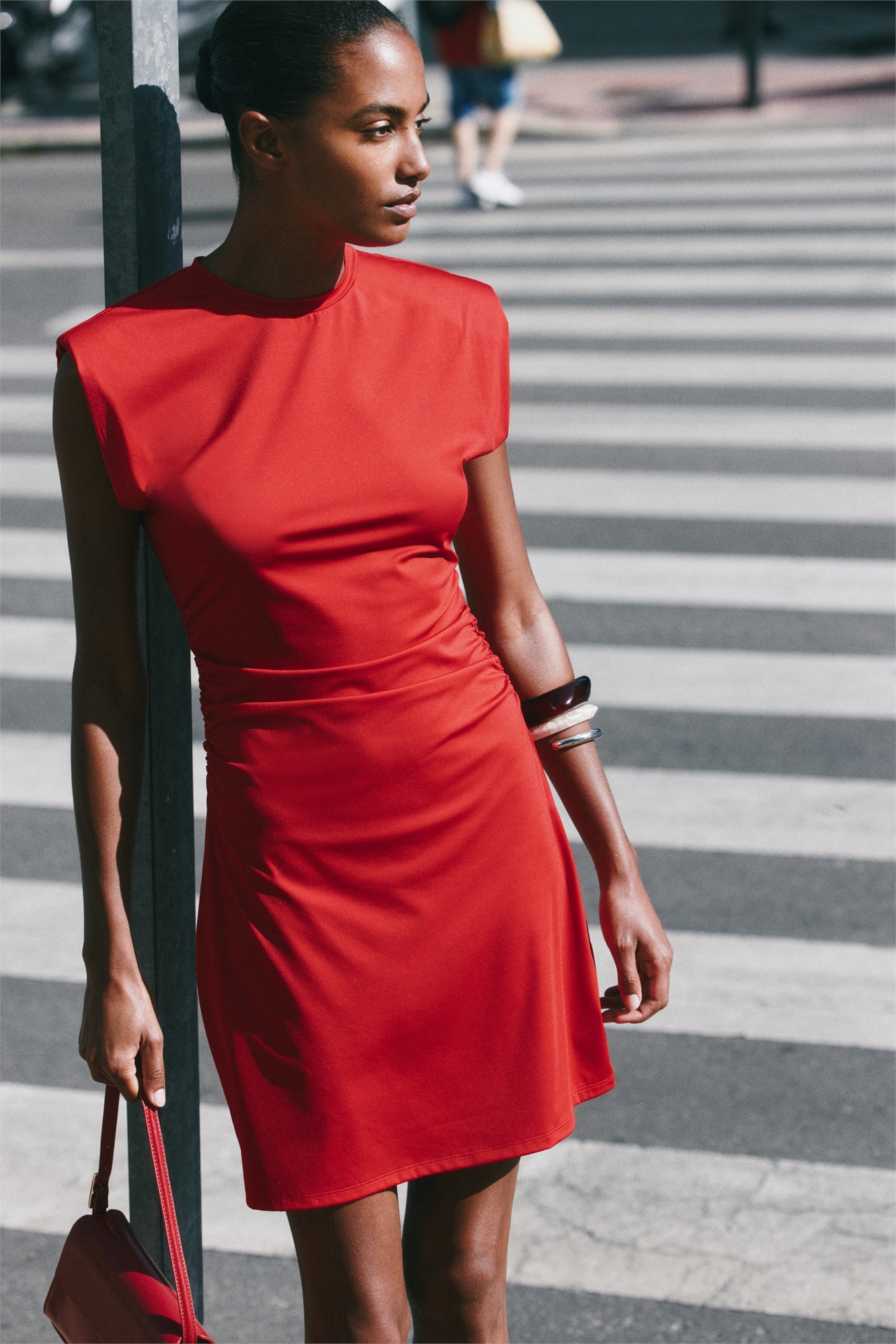 Облегающее мини-платье из плотного трикотажа интерлок с горловиной и смелыми подплечниками. Зауженная талия со складками по бокам для создания привлекательного силуэта.