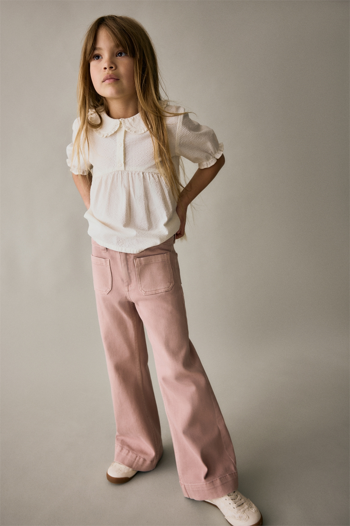 Джинсы из мягкого денима из хлопкового микса с обычной посадкой по бедрам и бедрам и расклешенными ногами. Регулируемая резинка на талии, ширинка на молнии с кнопкой, накладные передние карманы и открытые задние карманы.