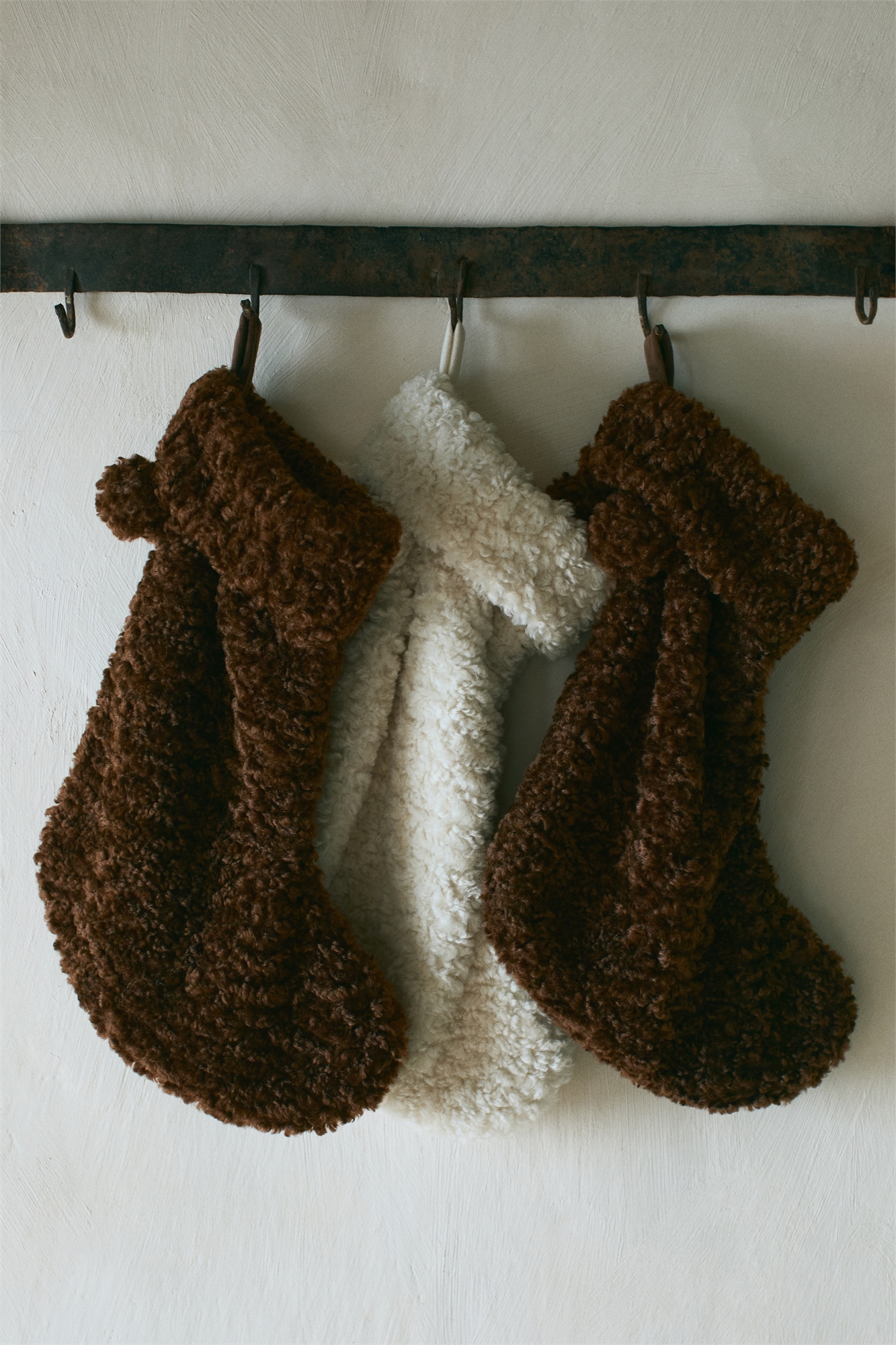 Рождественский чулок из мягкого пушистого ворса с игривыми помпонами, откидным краем и петелькой для подвешивания в верхней части.