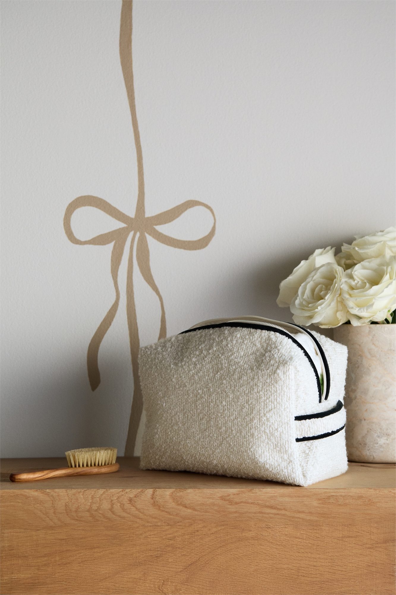 Сумка для пеленания из элегантной ткани букле с деталями из кружева и вышитым бантом на боковой стороне. Застежка-молния сверху, ручка на одной короткой стороне и открытое внутреннее отделение, в котором легко найти все необходимое во время пеленания.