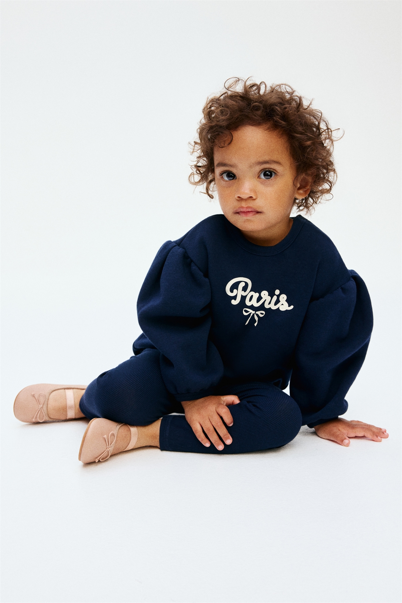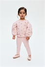 Комплект состоит из топа из толстовки с мягкой ворсистой изнанкой и леггинсов из мягкого ребристого трикотажа. Топ с принтом спереди и узким вырезом в рубчик с застежками с одной стороны (кроме размеров 2-4Y). Спущенные плечи, длинные рукава-баллоны и узкая тесьма на манжетах и подоле. Леггинсы с регулируемой резинкой на талии.