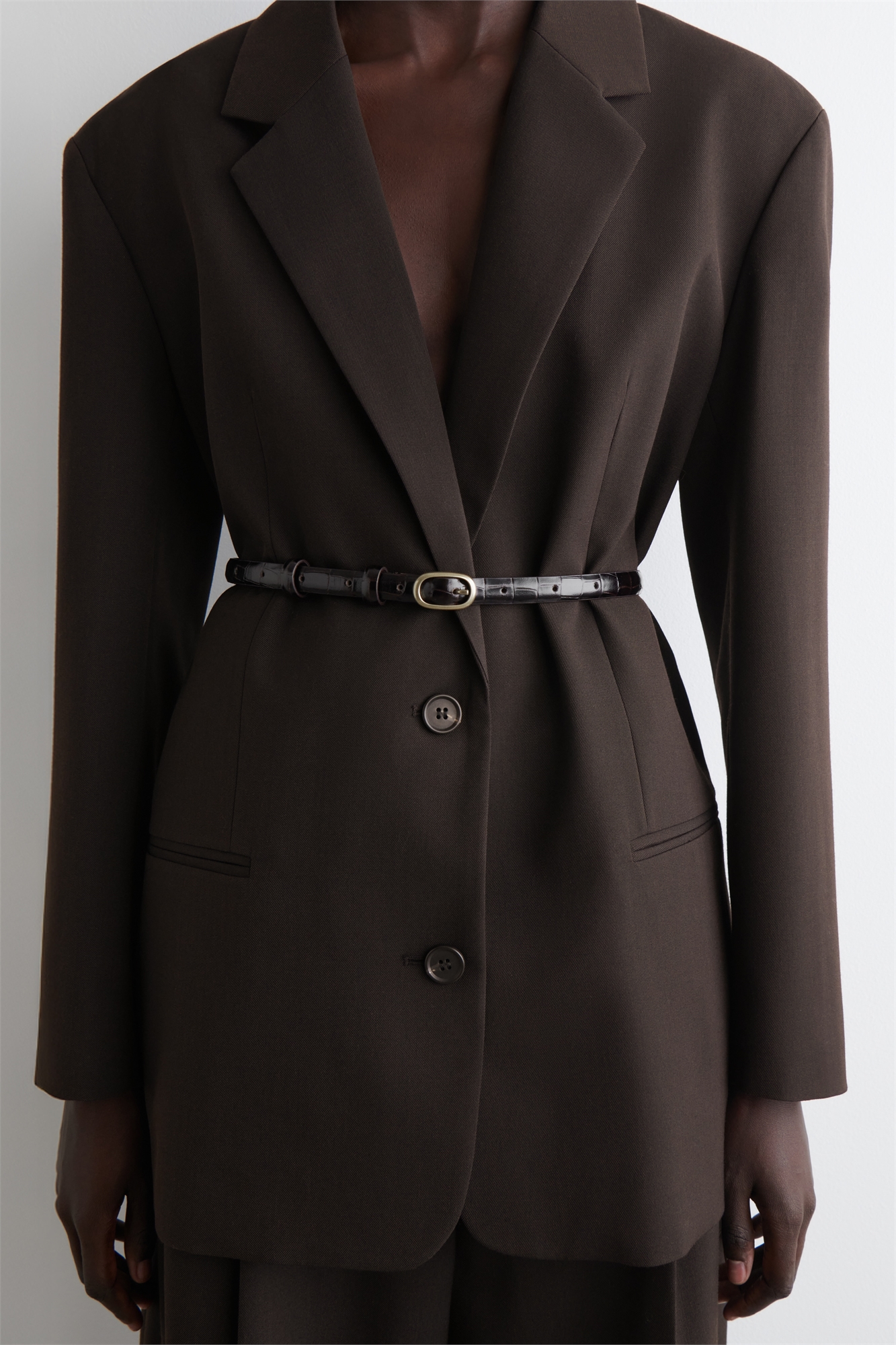 Этот изысканный ремень изготовлен из эластичной бесхромовой кожи и украшен фактурным узором с эффектом крокодила. Он выполнен в тонком силуэте и застегивается скульптурной овальной пряжкой серебряного цвета. Подберите его к фраку или дениму. Застежка-пряжкаCOS поддерживает ответственное производство через Leather Working Group Корпус и подкладка: 100% кожа. Без учета отделки Общая длина размера XS/S - 77 см, M/L - 95 см.
