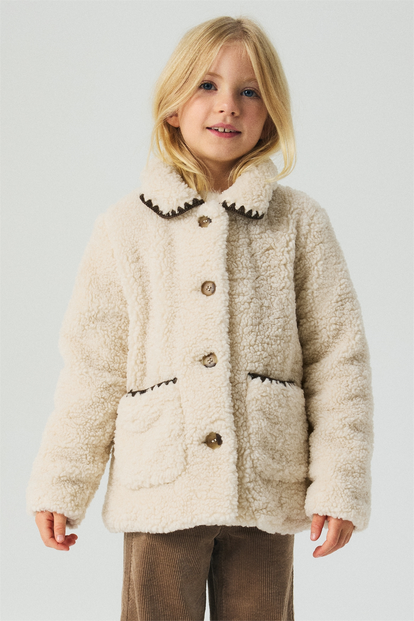 Жакет A-line из мягкого тедди с закругленным воротником, пуговицами спереди и накладными карманами спереди. Вышитые канты контрастного цвета на воротнике и карманах. На подкладке.