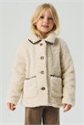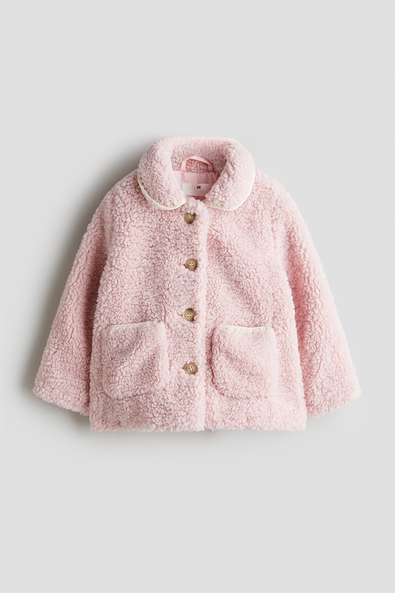 Жакет A-line из мягкого тедди с закругленным воротником, пуговицами спереди и накладными карманами спереди. Вышитые канты контрастного цвета на воротнике и карманах. На подкладке.
