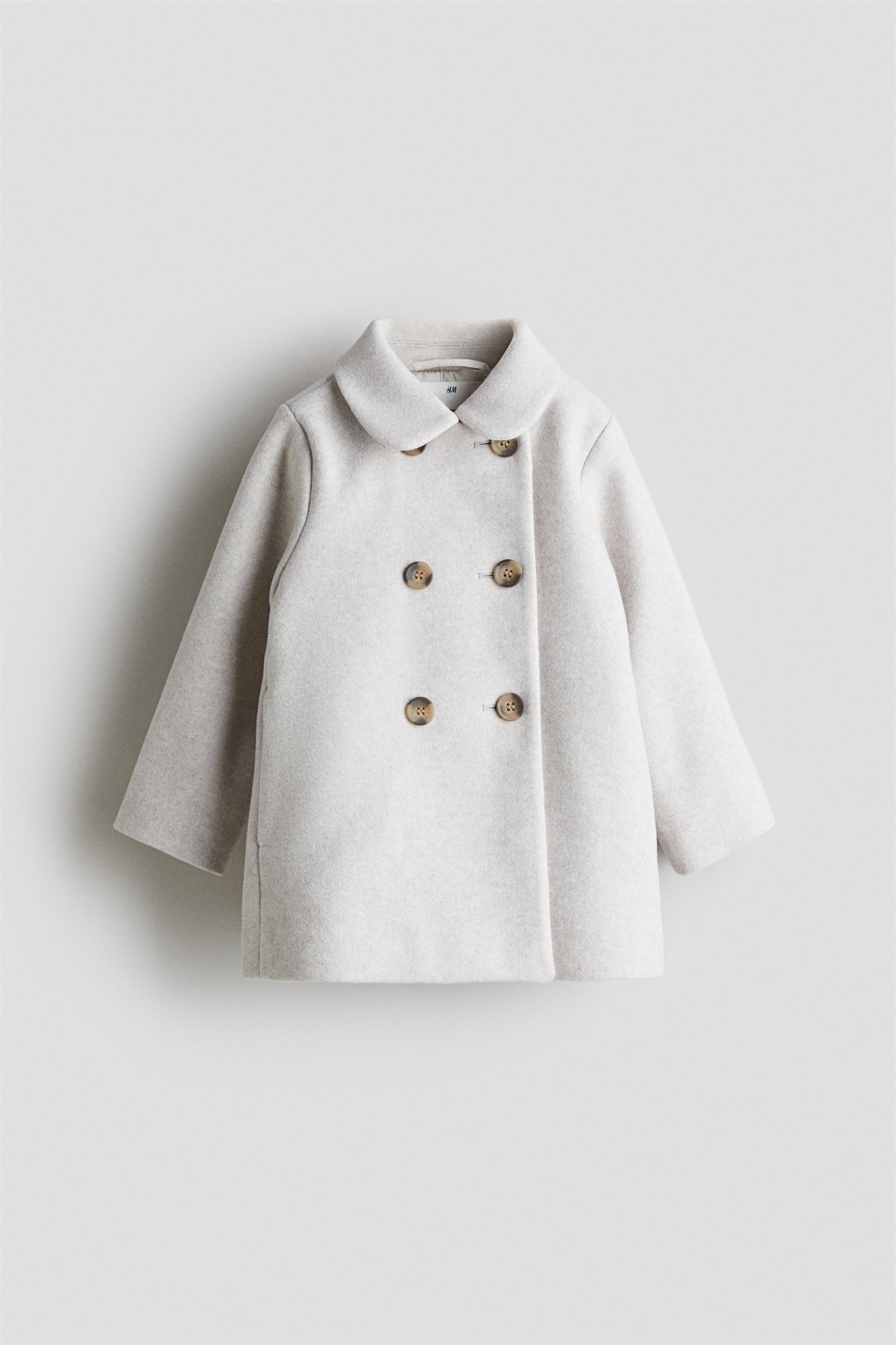 Двубортное пальто из войлока с округлым воротником, пуговицами спереди и спущенными плечами. На подкладке.