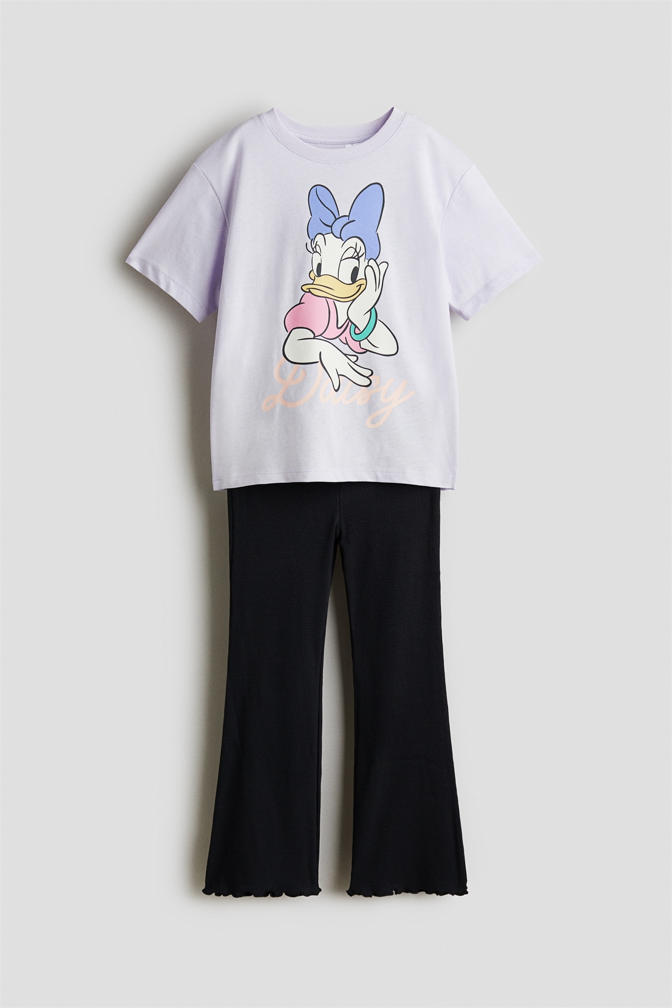 Комплект из футболки и леггинсов из мягкого хлопкового джерси. Футболка с принтом спереди и круглым вырезом с ребристой отделкой. Ребристые леггинсы с расклешенными ногами и оверлочной отделкой по подолу.