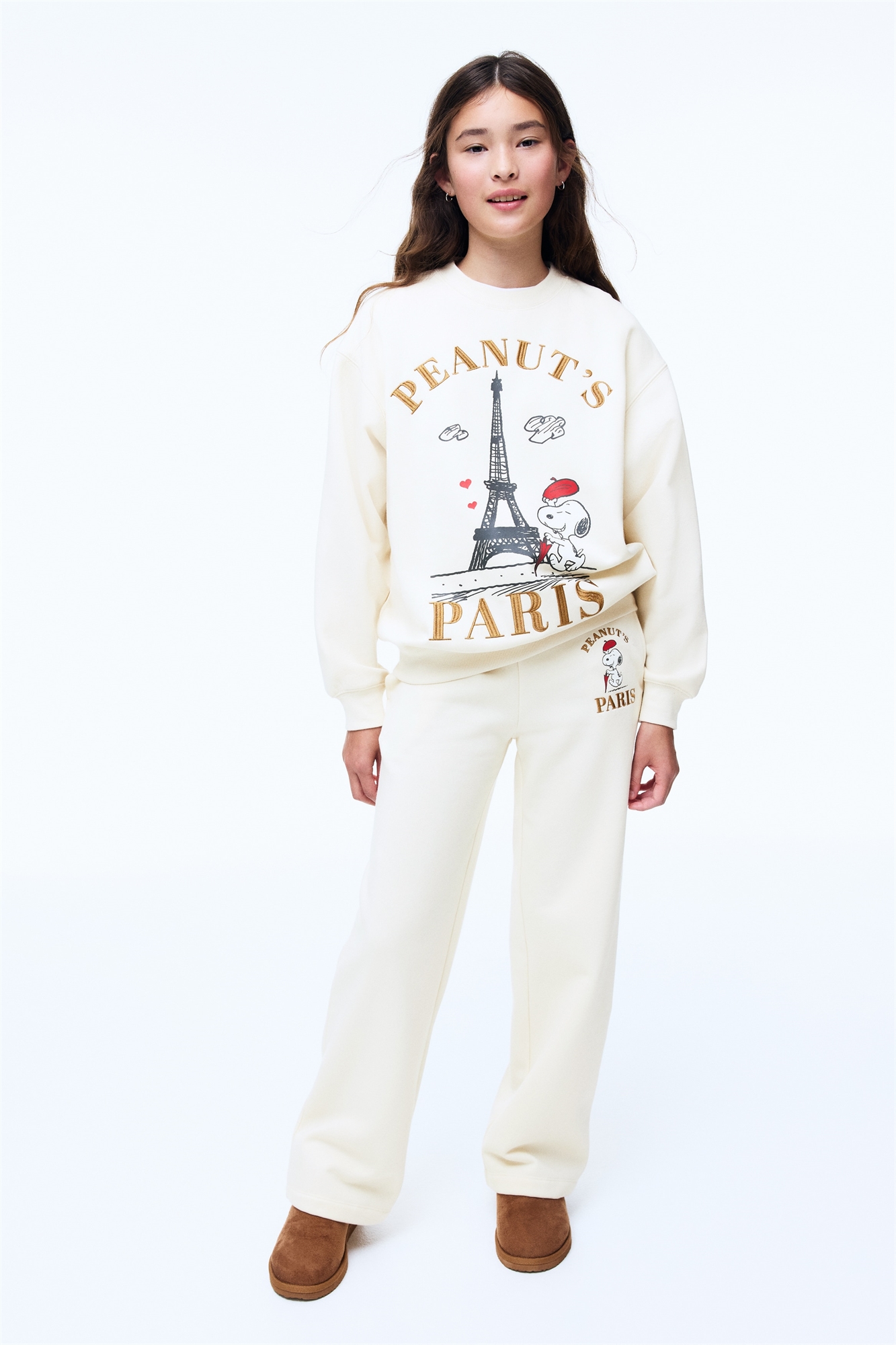 Джоггеры из толстовочной ткани с мягкой ворсистой внутренней стороной и принтом. Эластичная резинка на талии, незаметные боковые карманы и широкие штанины.