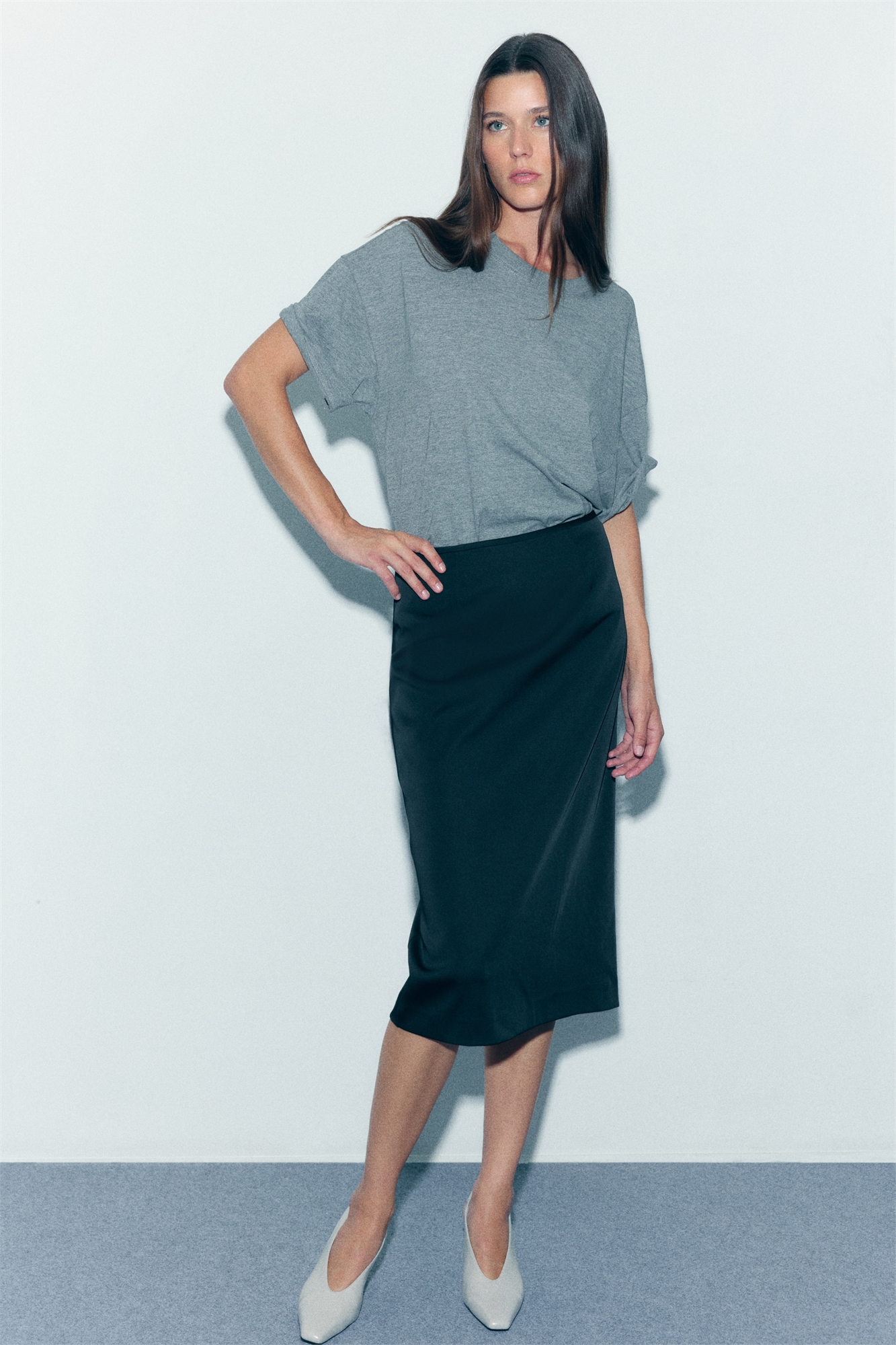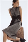 Приталенная юбка длиной до колена из тканого материала с высокой талией, вытачками спереди и сзади и потайной застежкой на молнию и крючок с ушком с одной стороны. Подол прямого покроя с разрезом сзади. Без подкладки.