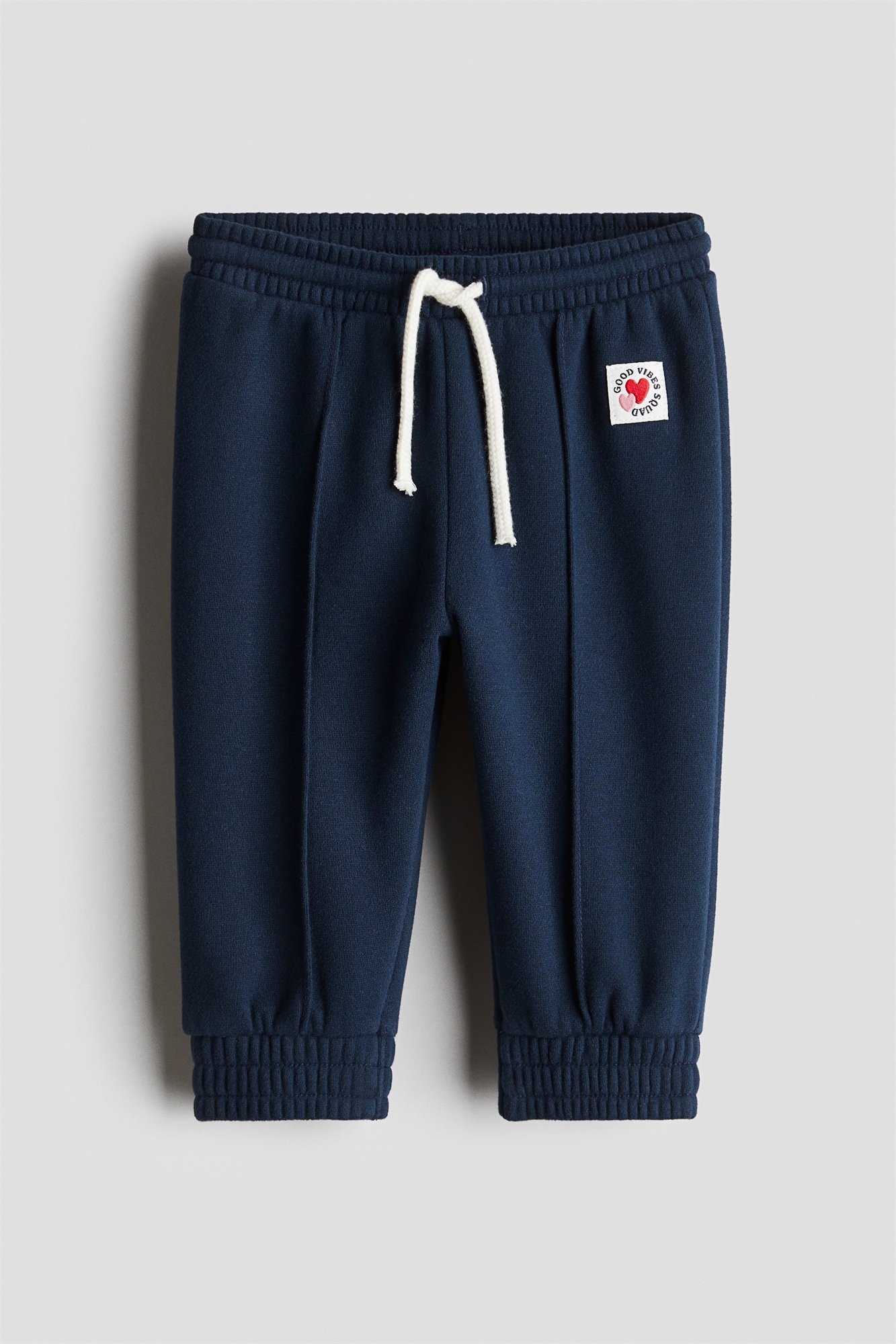 Джоггеры из толстовочной ткани с мягкой ворсистой внутренней стороной. Эластичная вставка с утягивающим шнурком на талии, небольшая аппликация спереди и пришитые складки по ногам. Эластичная отделка по краям.
