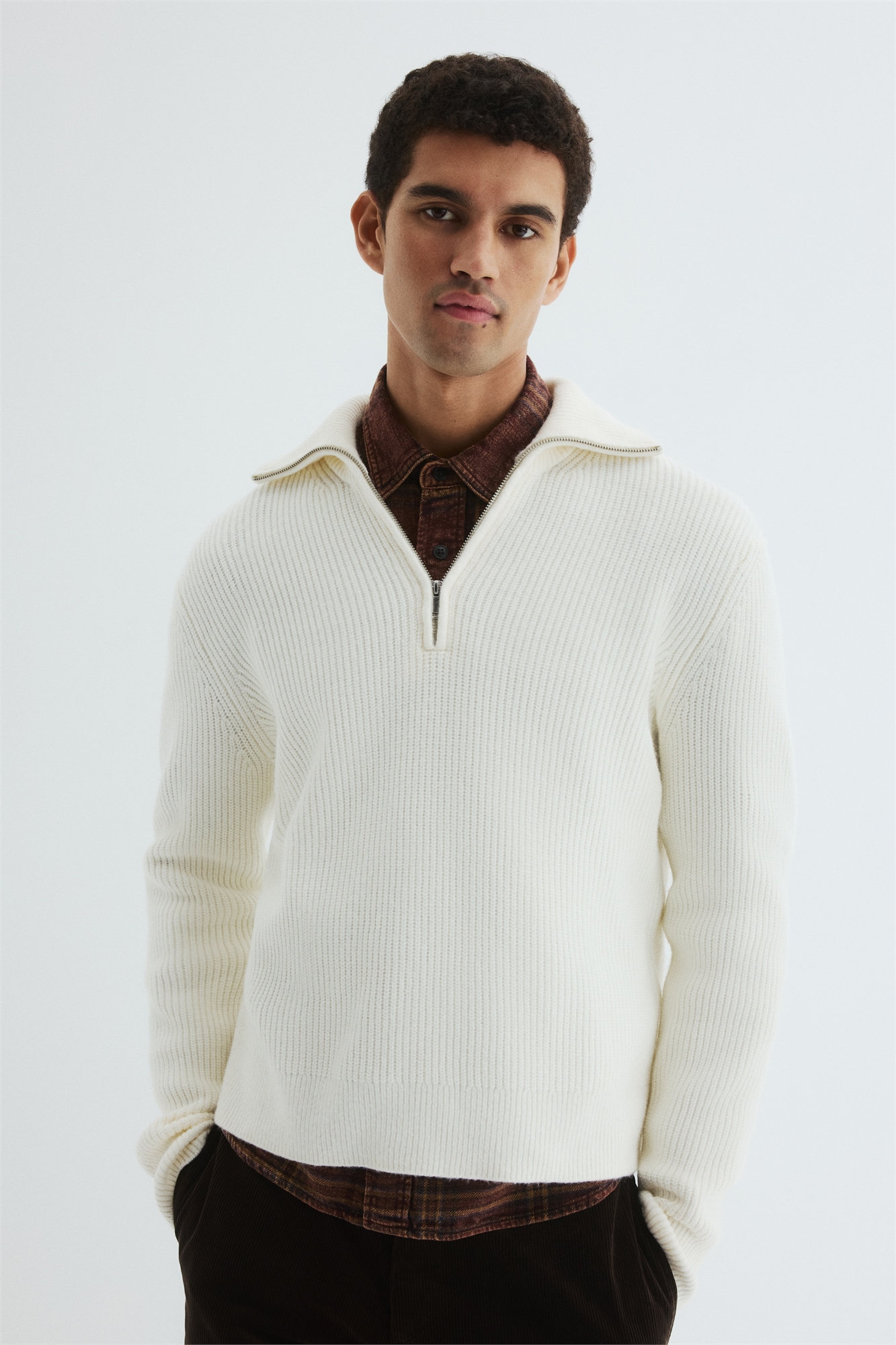 Джемпер из мягкого трикотажа в рубчик с воротником-стойкой, застежкой на молнию, длинными рукавами и прямым подолом. Тонкий рубчик вокруг воротника, на манжетах и подоле. Регулярный крой для комфортной носки и классического силуэта.
