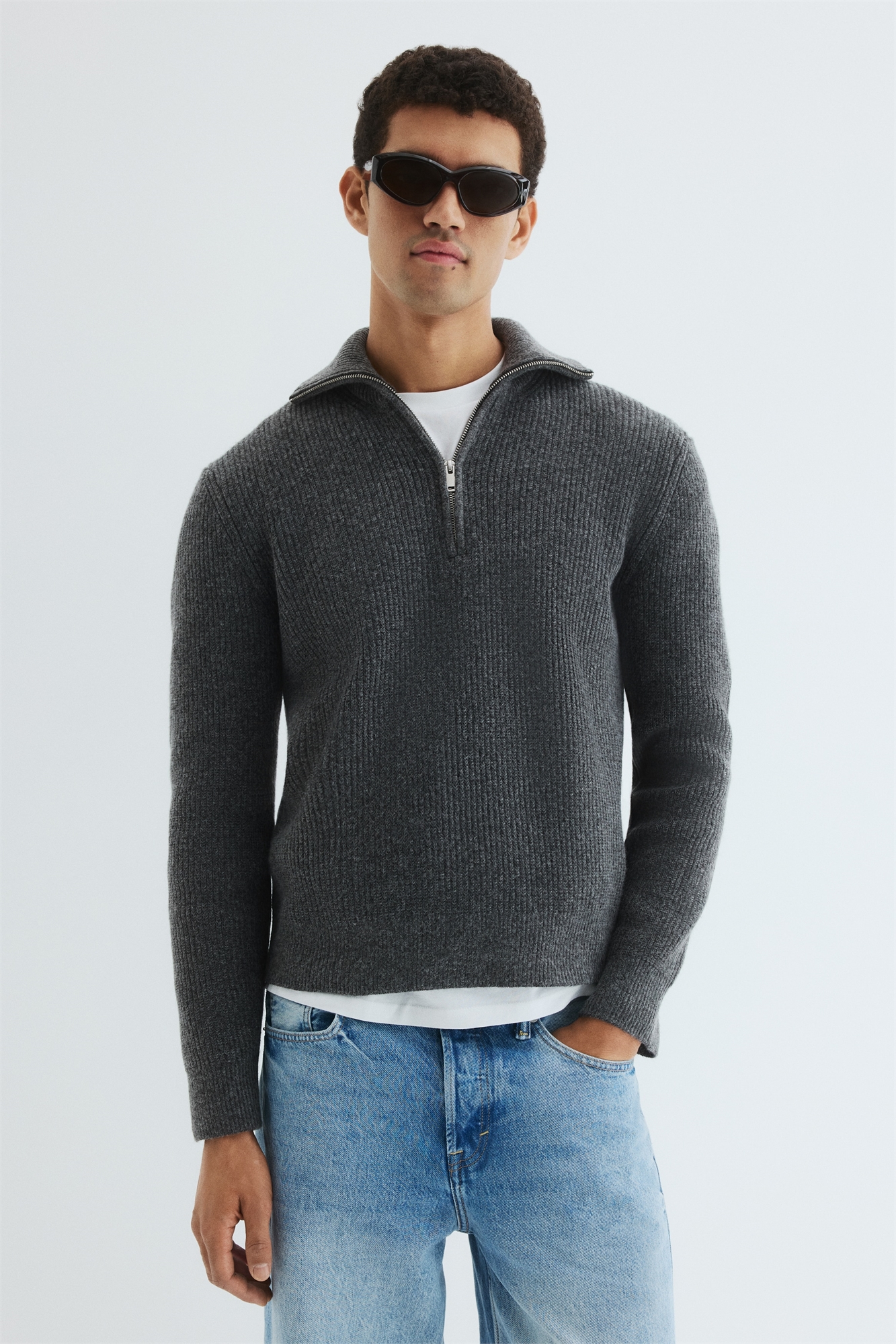 Джемпер из мягкого трикотажа в рубчик с воротником-стойкой, застежкой на молнию, длинными рукавами и прямым подолом. Тонкий рубчик вокруг воротника, на манжетах и подоле. Регулярный крой для комфортной носки и классического силуэта.