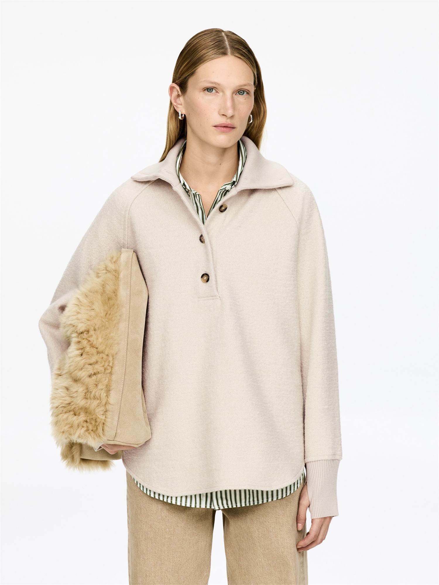 Джемпер из смеси вареной шерсти и хлопка. Полустойка с застежкой на пуговицы и двухслойный ребристый воротник. Рукава реглан и широкие манжеты с отверстиями для больших пальцев.