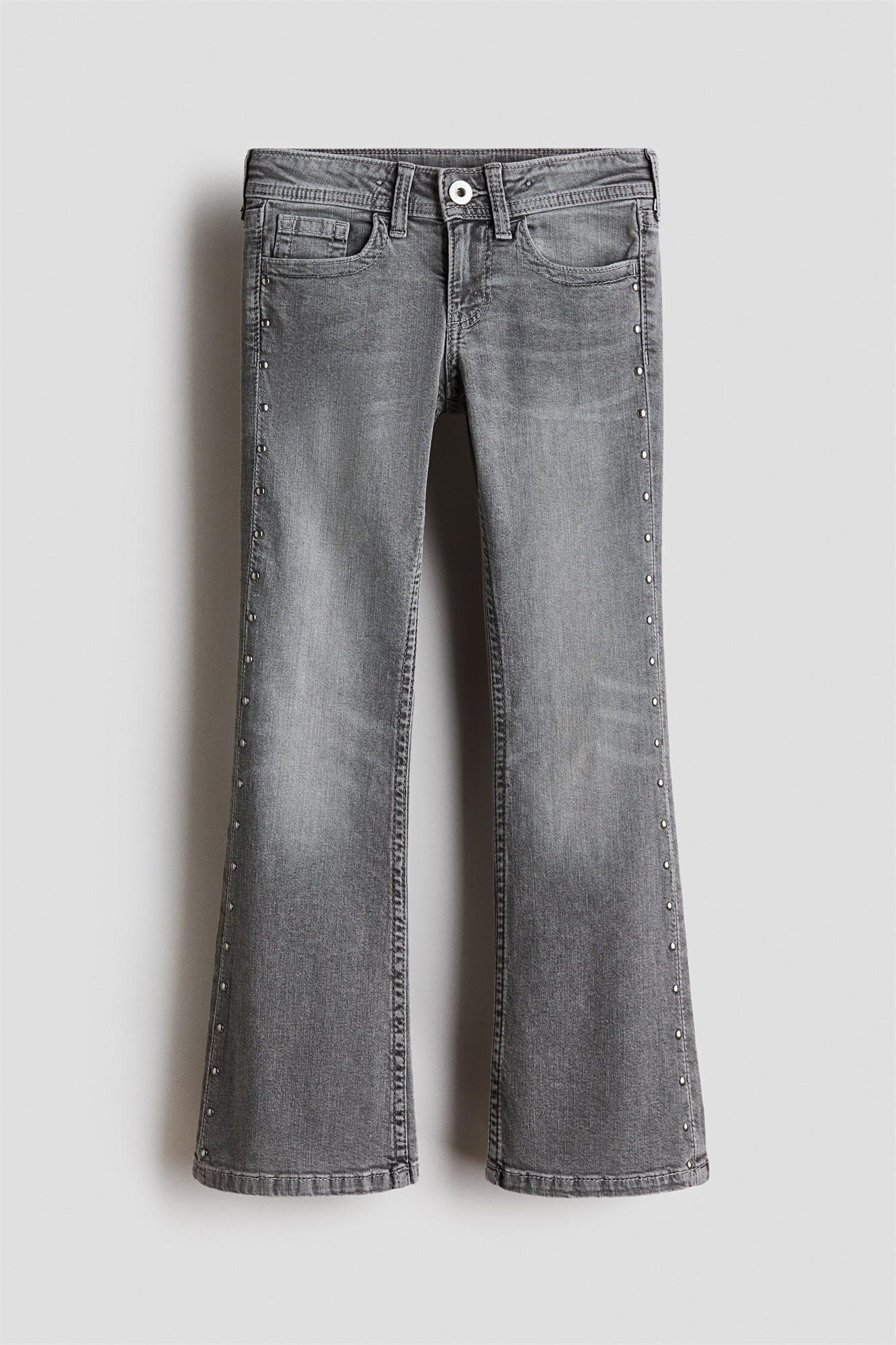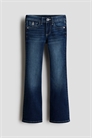 Джинсы из мягкого, эластичного хлопкового денима с зауженной посадкой по бедрам и бедрам и расклешенными ногами. Заниженная талия с регулируемой резинкой, ширинка на молнии и пуговице, карман для монет с клапаном на пуговице, открытые передние карманы и задние карманы с клапанами на пуговицах.