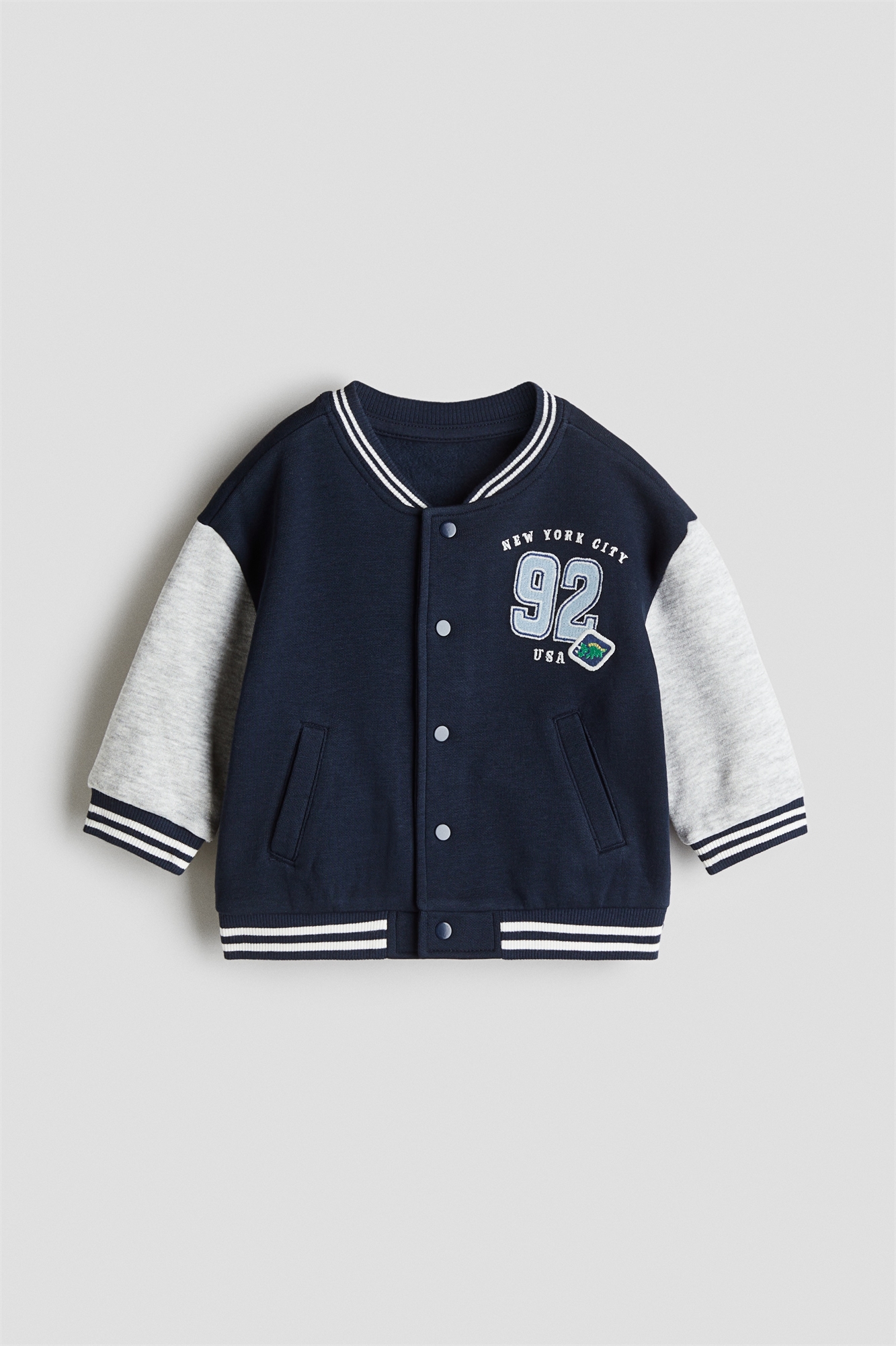 Бейсбольная куртка блочного цвета из джерси с мягким начесом внутри и вышитыми деталями спереди. Ребристый воротник, застежки на кнопки спереди и прорезные передние карманы. Спущенные плечи, манжеты и подол в рубчик.