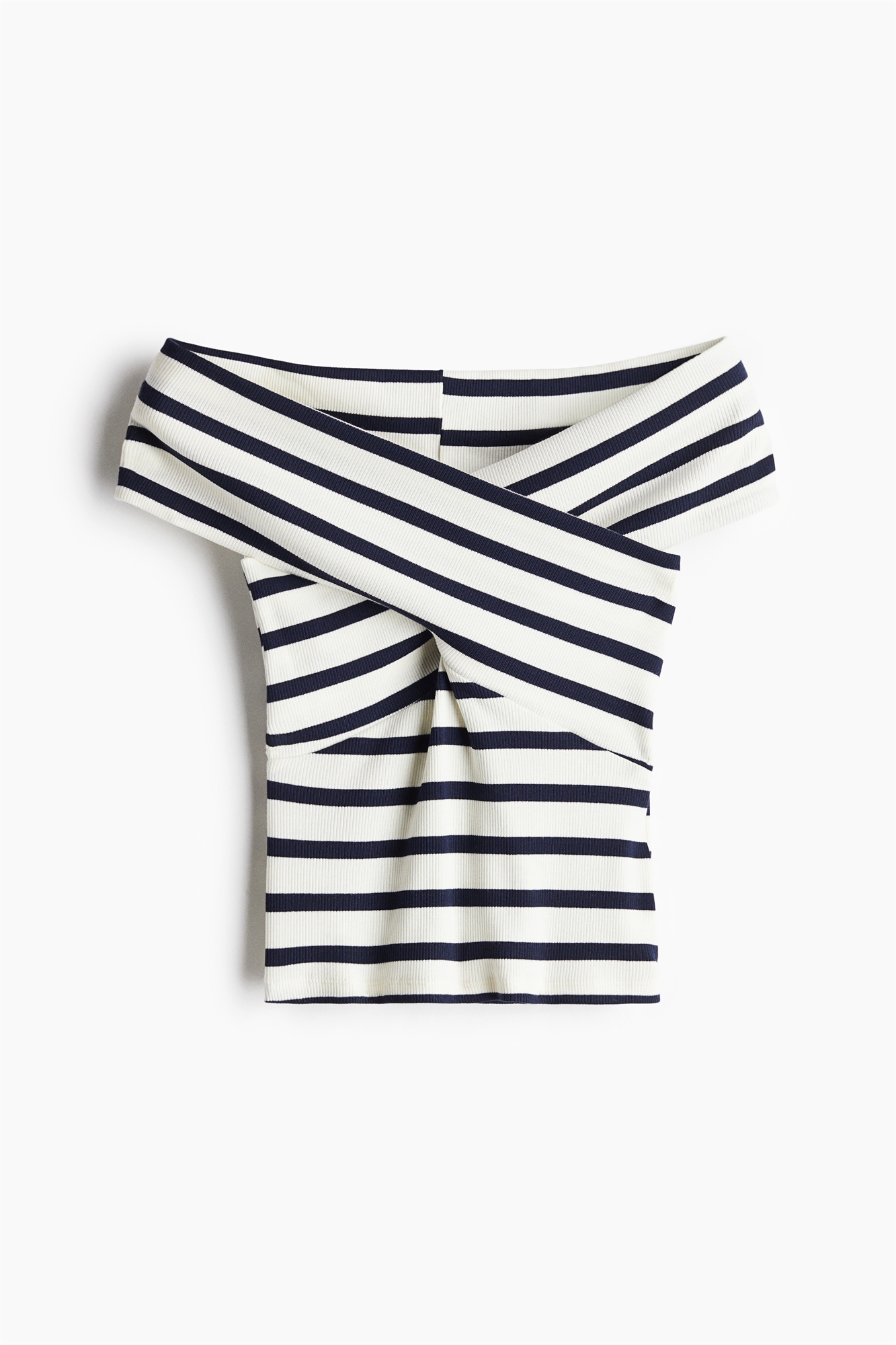 Короткий приталенный топ без плеч из мягкого ребристого трикотажа с декоративной деталью в виде обхвата спереди.